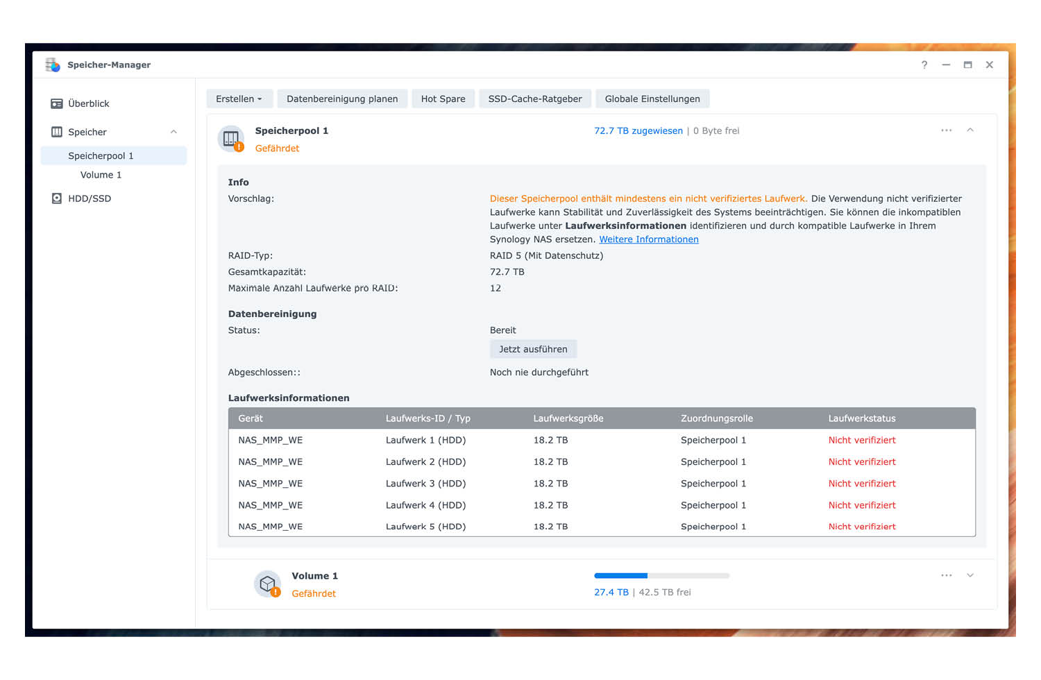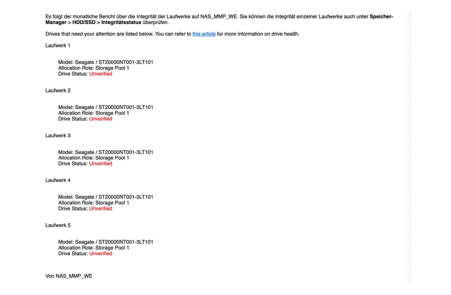Ihr seht einmal die Ansicht im Speichermanager und einmal die monatliche E-Mail mit dem Hinweis, dass es sich um nicht verifizierte Festplatten handelt.