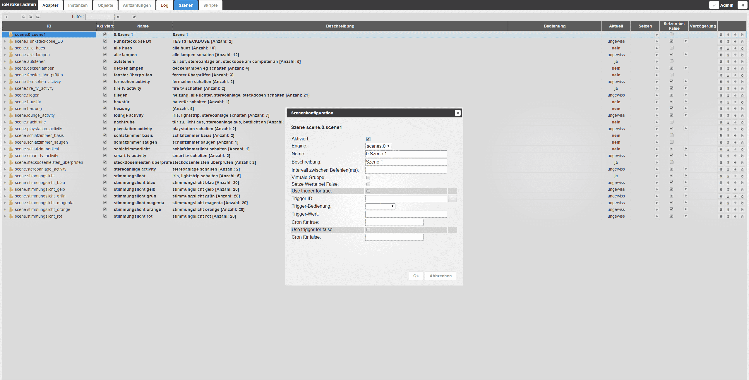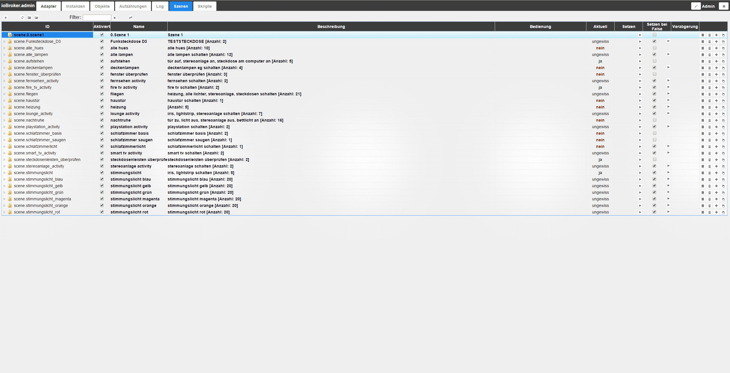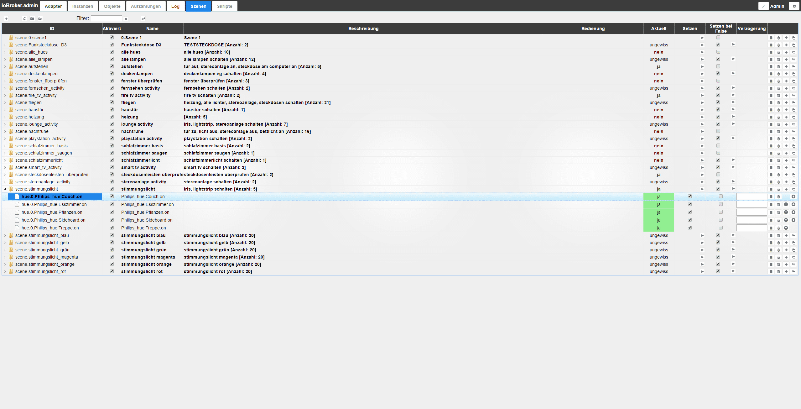 Für mich stellt der Szenen Adapter den Mittelpunkt von ioBroker dar. Mit ihm lassen sich so viele Dinge realisieren, die man ohne ihn einfach nicht hätte umsetzten können. Er ist vielseitig einsetzbar und es finden sich immer neue Anwendungsbereiche in denen man ihn nutzen kann.
