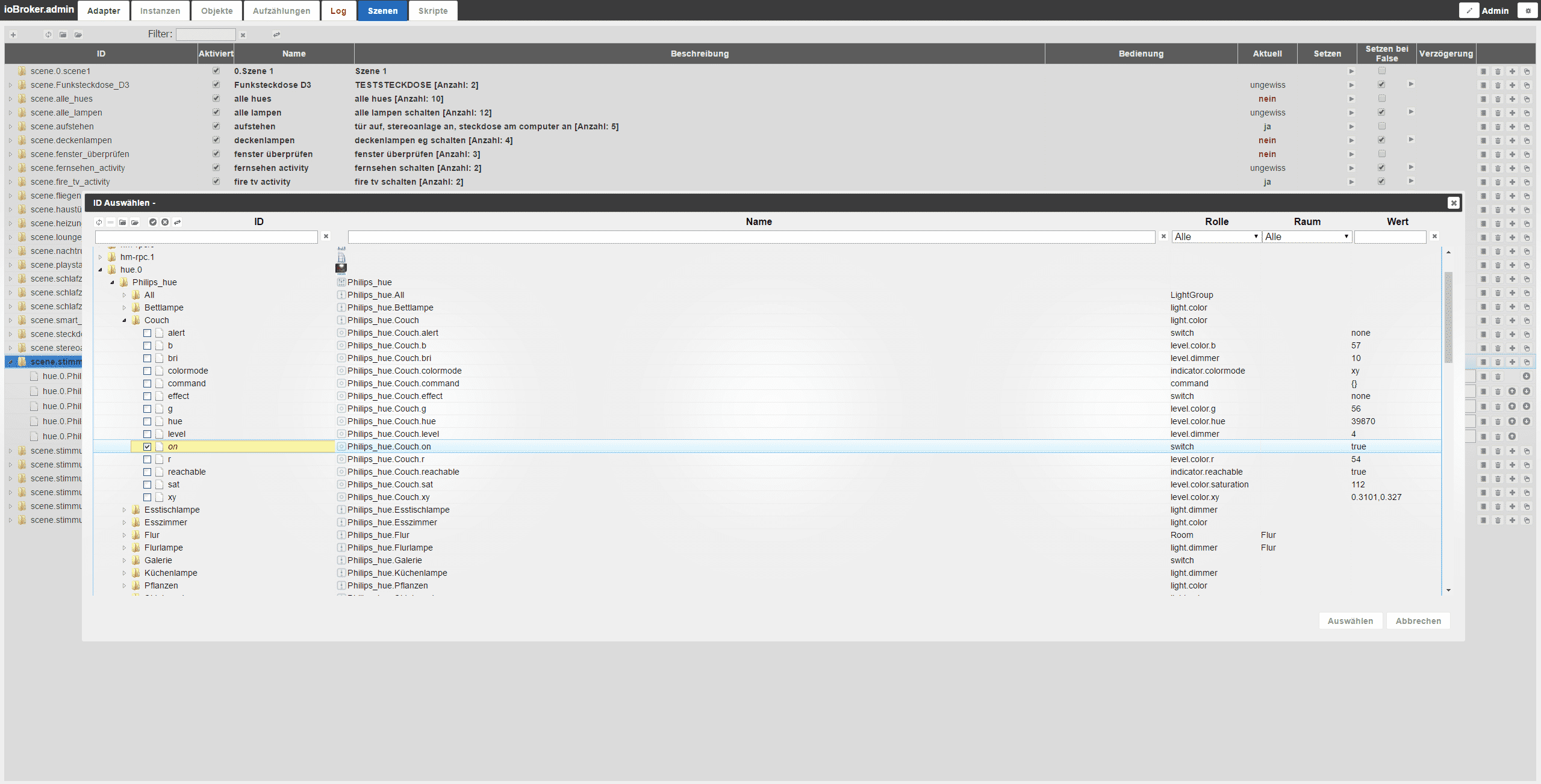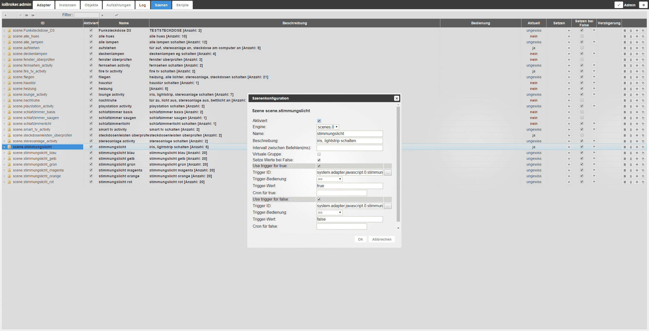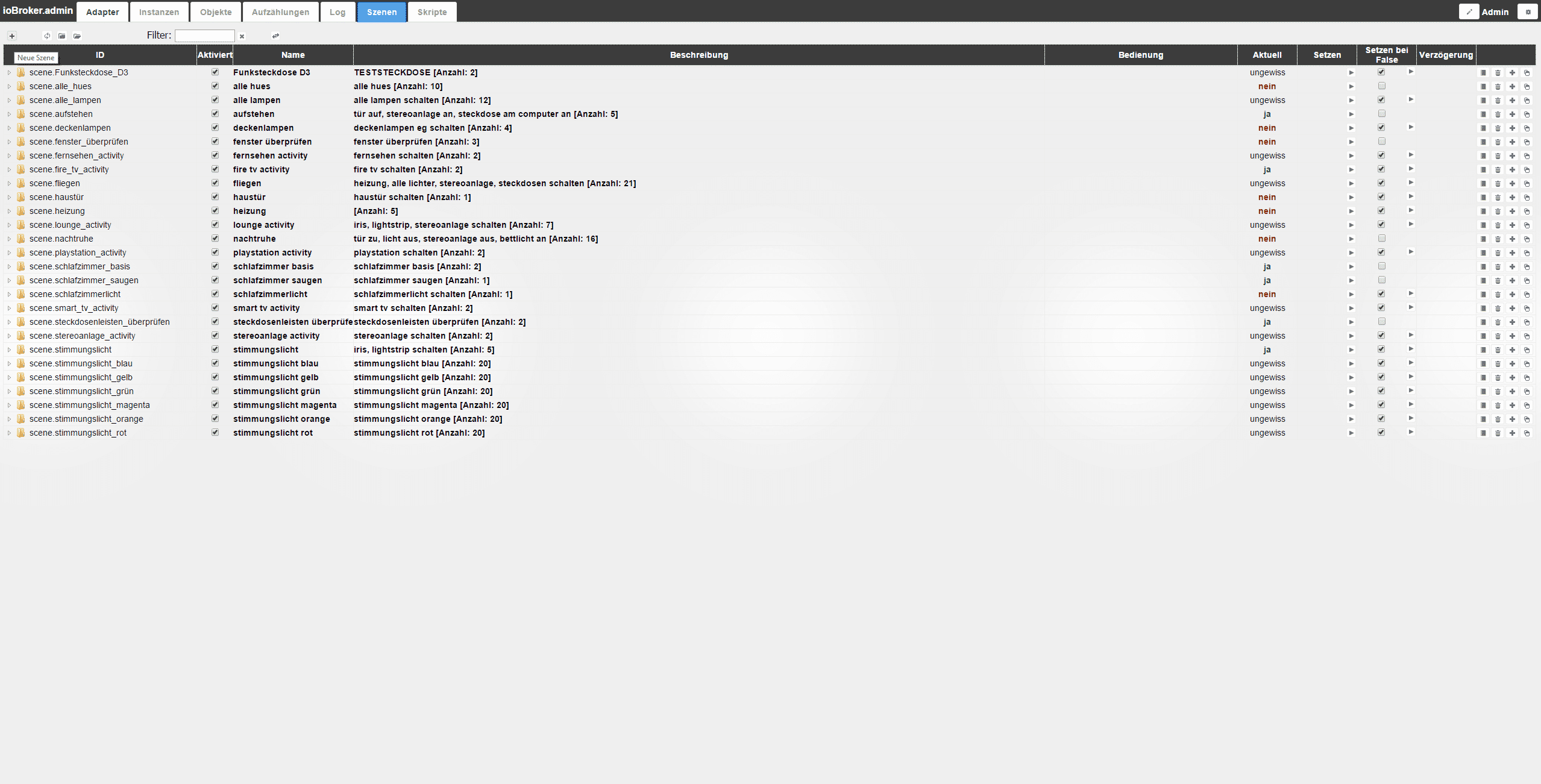 Für mich stellt der Szenen Adapter den Mittelpunkt von ioBroker dar. Mit ihm lassen sich so viele Dinge realisieren, die man ohne ihn einfach nicht hätte umsetzten können. Er ist vielseitig einsetzbar und es finden sich immer neue Anwendungsbereiche in denen man ihn nutzen kann.