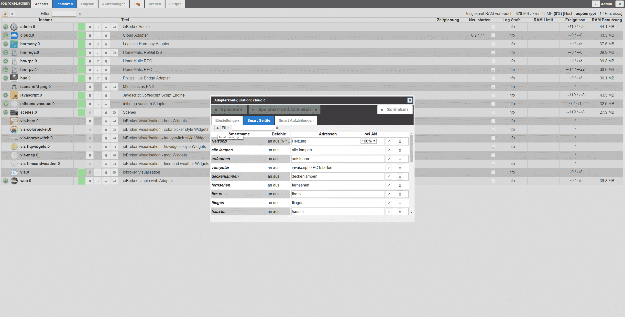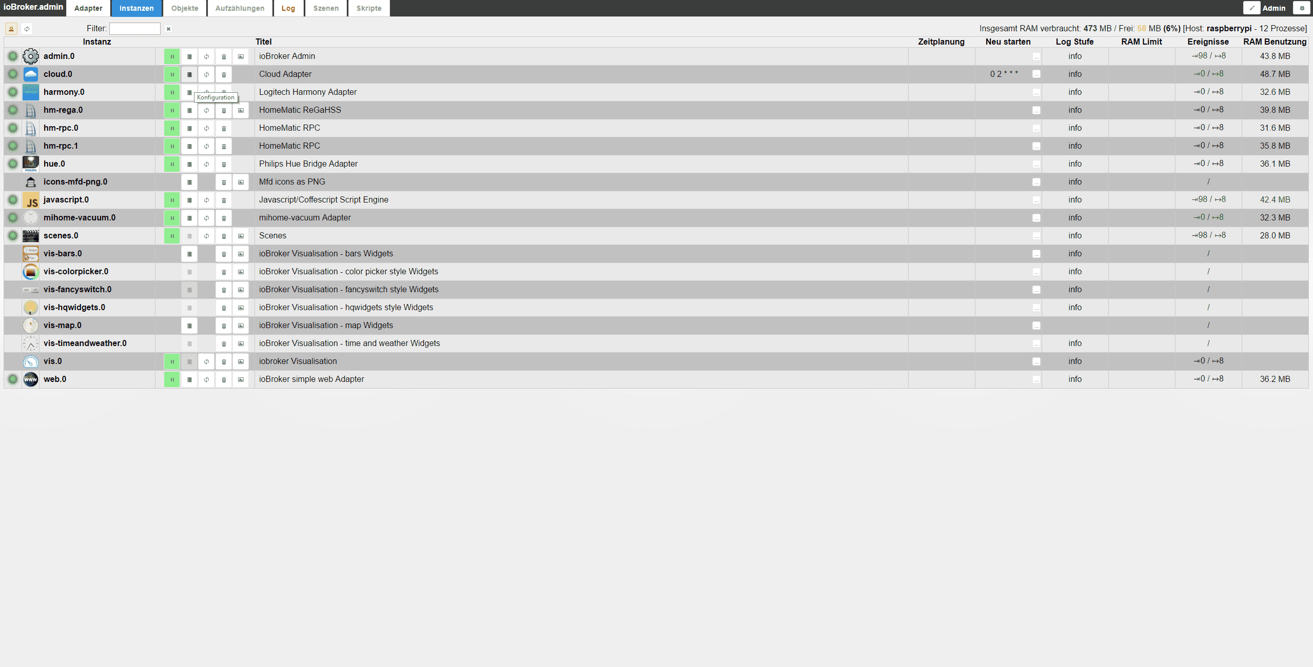 - Wechselt nun zu dem Tab „Instanzen“. Klickt bei dem Cloud Adapter auf das zweite Symbol (Konfiguration).