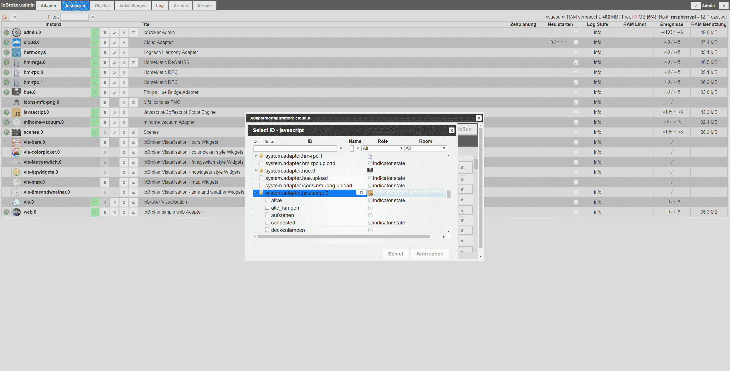 - Hier wählt ihr das Objekt aus, das wir am Anfang erstellt haben. Es befindet sich unter dem Reiter „system.adapter.javascript“ und heißt „stimmungslicht“.
