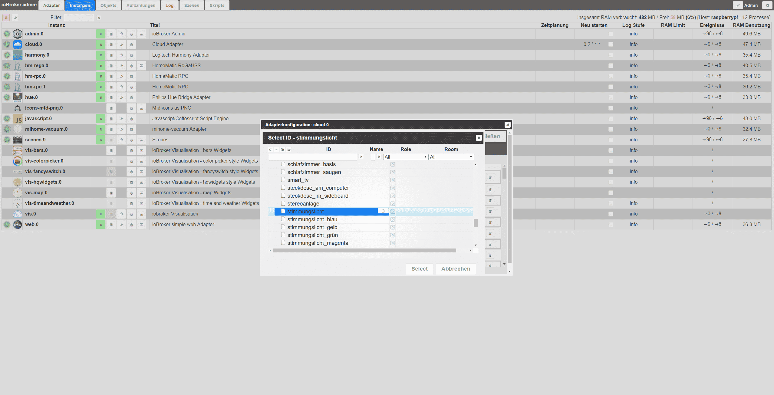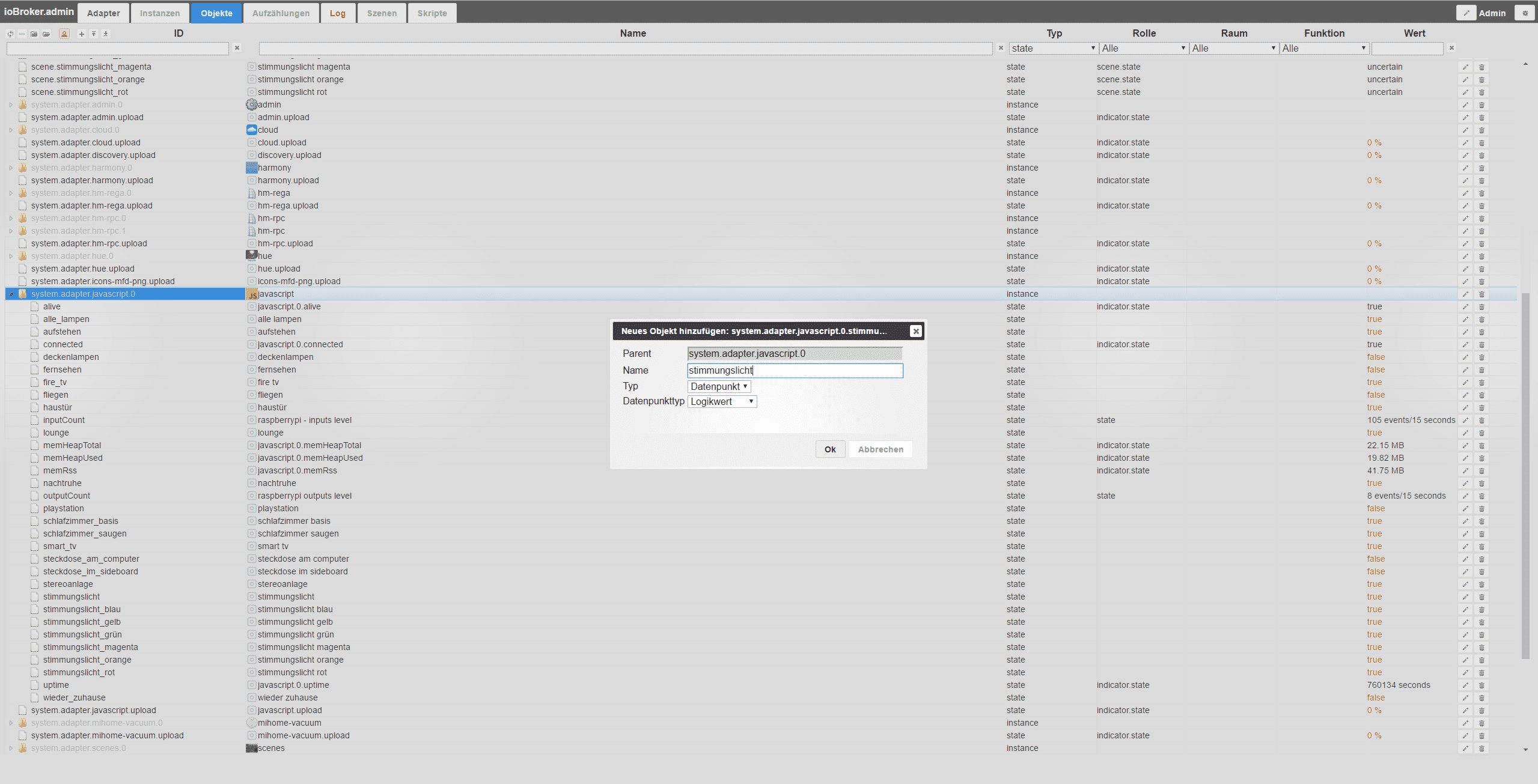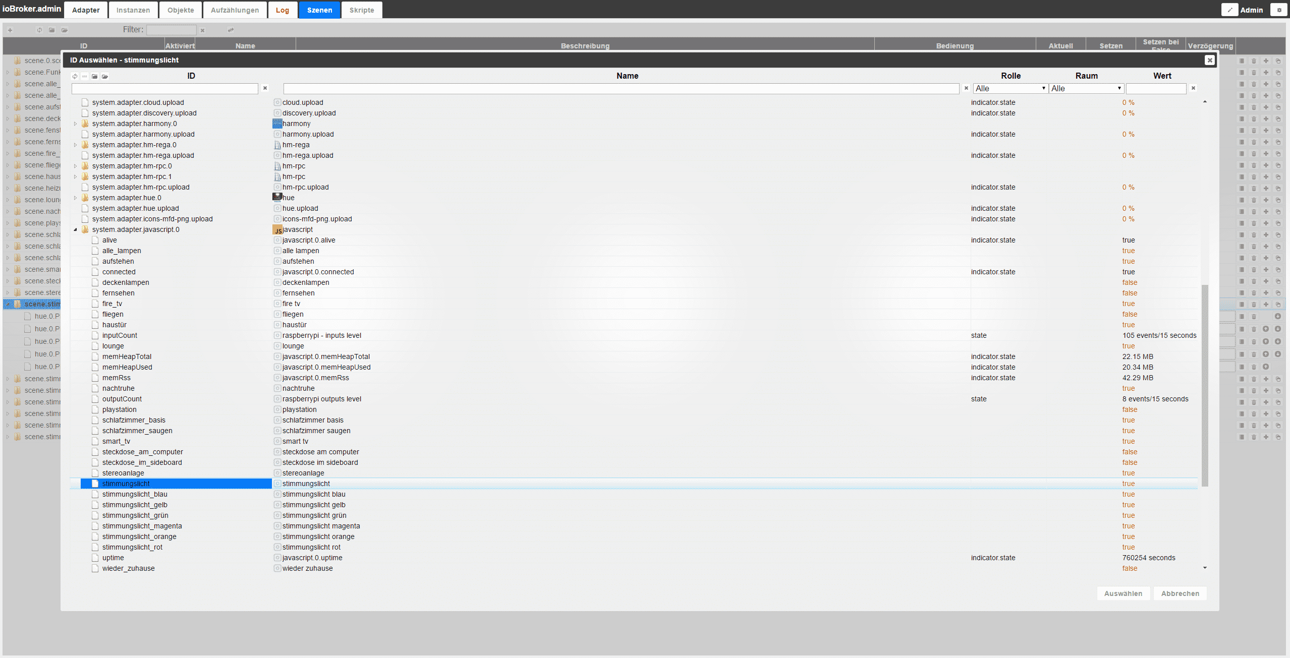 - Wählt nun „stimmungslicht“ aus dem Ordner der Objekte aus, in dem ihr es vorhin erstellt habt. (System.Adapter.Javascript)