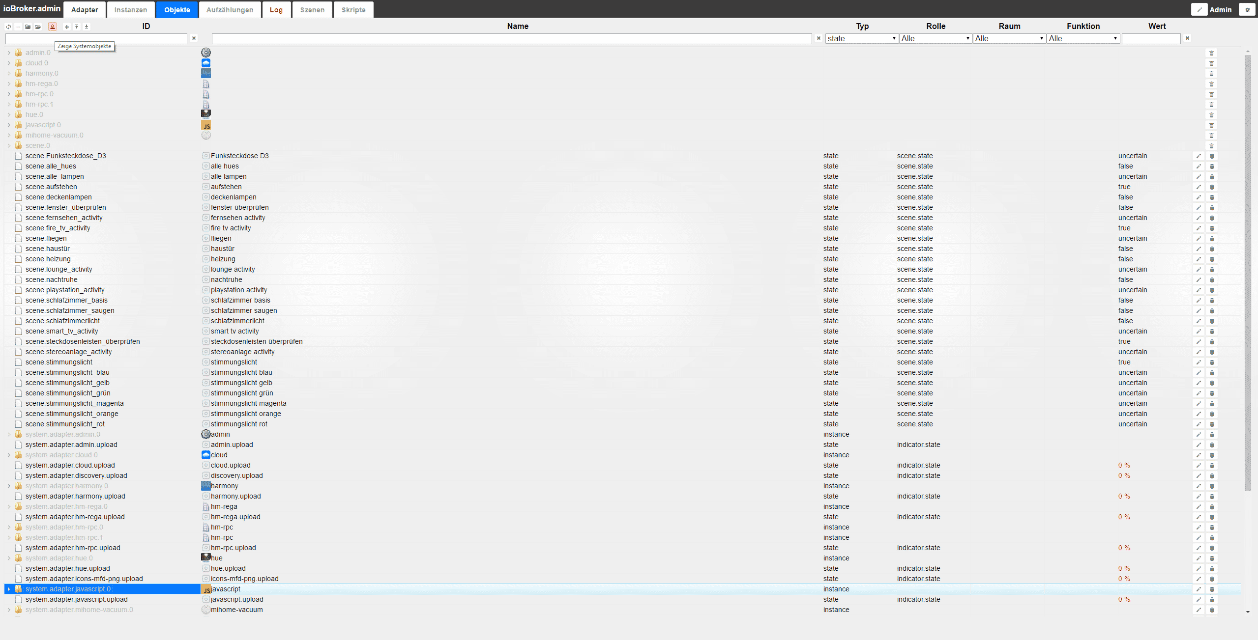 - Wechselt nun auf das Tab „Objekte“ und klickt oben links auf den 5. Button. Dadurch seht ihr zusätzlich die Ordnerstruktur der Systemordner. Es geht nun darum, in welchem Ordner ihr eure „Sprachbefehle“ bzw. neu erstellten „Objekte“ abspeichert. Ich habe mich für den Systemordner system.adapter.javascipt entschieden. Letztendlich könnt ihr aber auch jeden anderen Ordner verwenden.