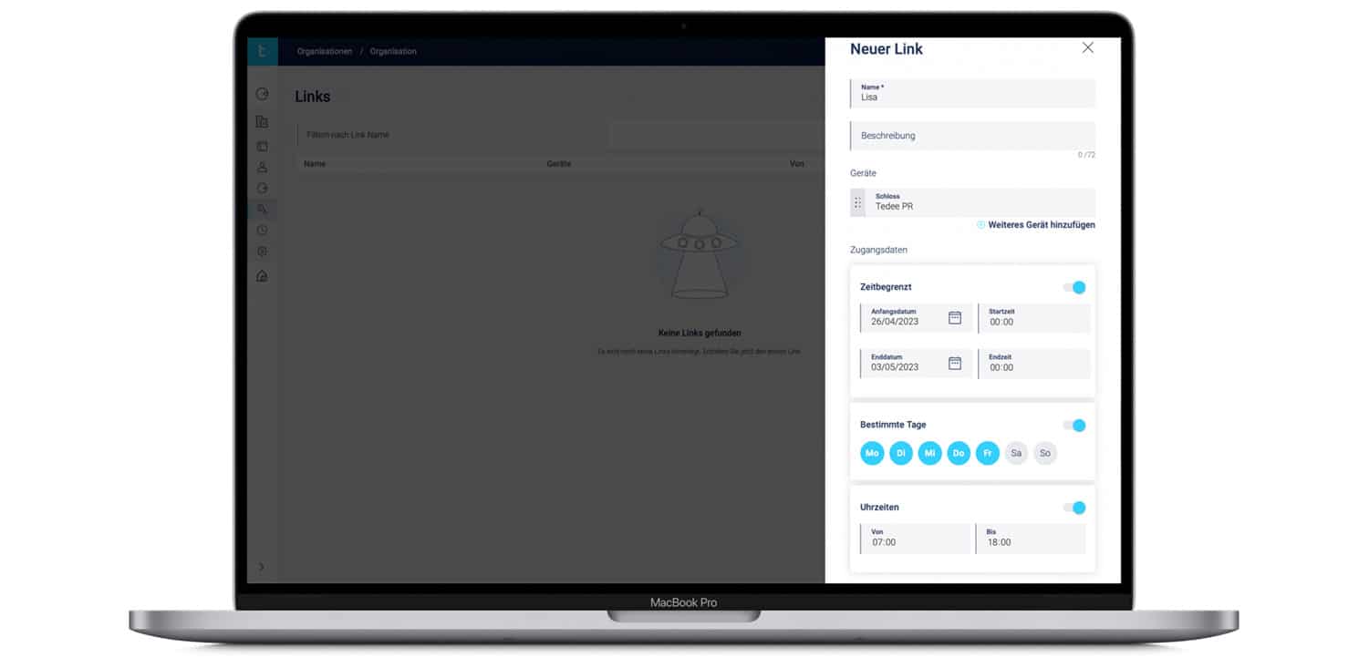 Über das Online-Portal kann ein Link erstellt werden, den Besucher beispielsweise auf dem Smartphone antippen. Dafür ist keine Registrierung über die App nötig. Es langt lediglich eine E-Mail oder eine Nachricht über einen Messenger, der diesen Link enthält. Um einen Link zu generieren, muss das ausgewählte Schloss im Portal einer Organisation hinzugefügt werden. Im Anschluss können im Organisationsbereich „Links“ Zugänge per Link konfiguriert werden. Dabei kann festgelegt werden, in welchem Zeitraum der Zugang gültig ist und ob der Gast nur an bestimmten Tagen oder zu festgelegten Uhrzeiten Zutritt erhalten soll.
