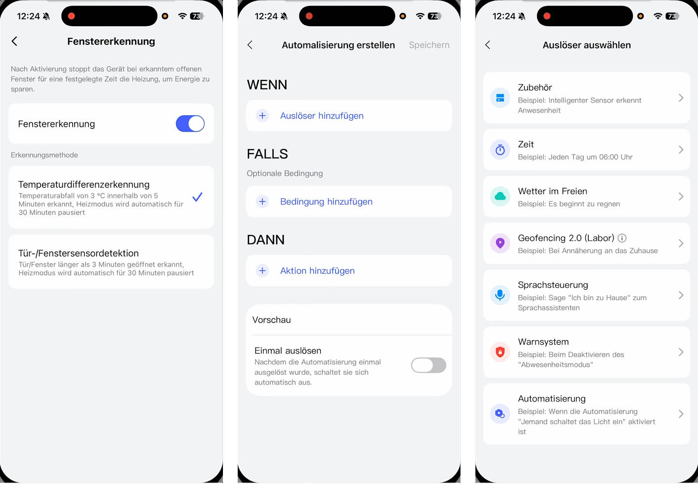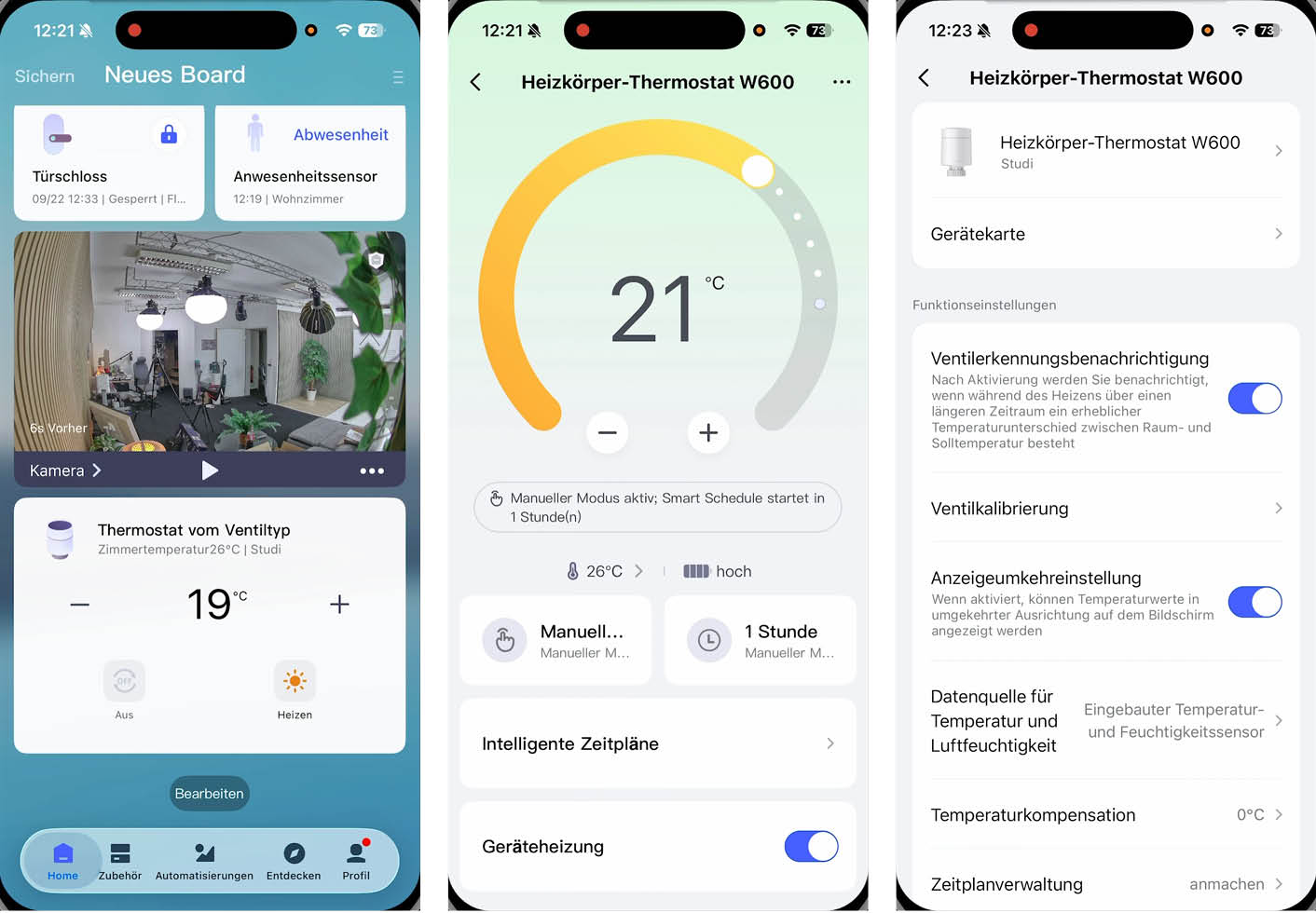 Ergänzend bietet die App Funktionen wie Fenstererkennung, Kindersicherung, Automationen und Geofencing, wodurch sich das Heizverhalten stark personalisieren lässt. Über Thread ist die Bedienung ebenfalls möglich, allerdings ohne die erweiterten Zeitpläne und einige der zusätzlichen Komfortfunktionen. Insgesamt bietet die App eine übersichtliche Steuerung, die über Zigbee besonders umfangreich ausfällt.