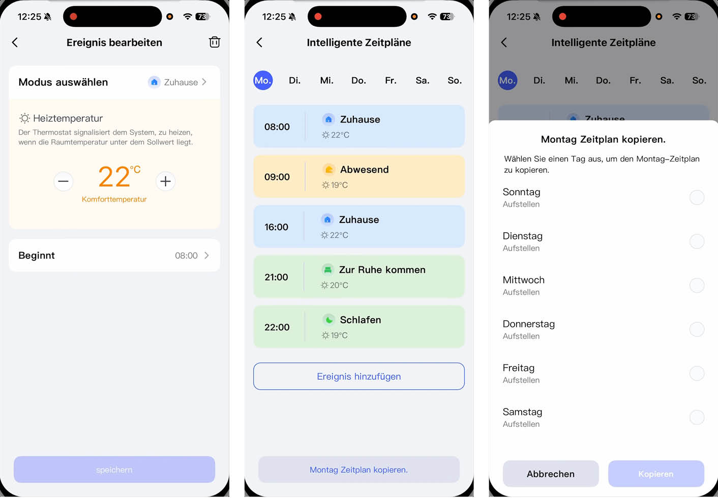 Die Temperatur kann dort in 0,5-Grad-Schritten eingestellt werden, während die App zusätzlich erlaubt, festzulegen, wie lange der manuelle Modus aktiv bleibt. Im Zigbee-Betrieb stehen umfangreiche Zeitpläne zur Verfügung, bei denen sich mehrere Heizblöcke pro Tag definieren und bequem auf andere Tage übertragen lassen.
