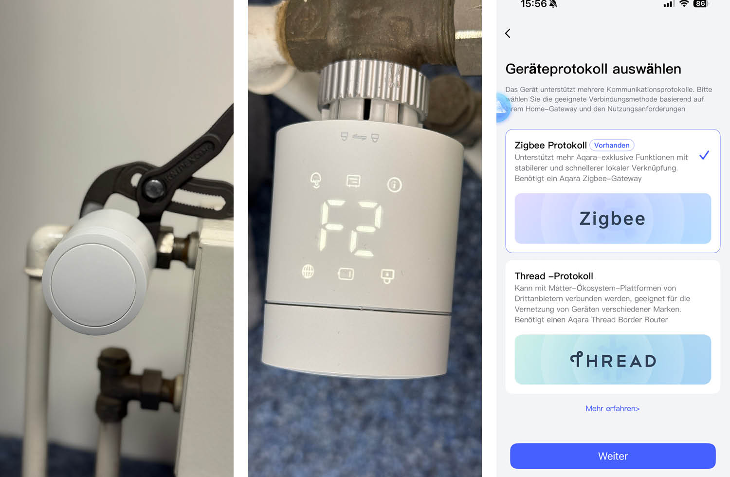 Sie stellt sicher, dass das Thermostat den Ventilweg korrekt erkennt und später präzise regeln kann. Abschließend erfolgt die Einbindung in die Aqara-App, in der man auswählen kann, ob das W600 über Zigbee oder über Matter over Thread verbunden werden soll. Beide Wege funktionieren zuverlässig, wobei Zigbee den vollen Funktionsumfang bietet und Thread etwas eingeschränkt ist. Wichtig zu beachten ist, dass ein Hub notwendig ist. Insgesamt ist die Installation angenehm einfach gehalten und ohne zusätzliche Werkzeuge machbar.
