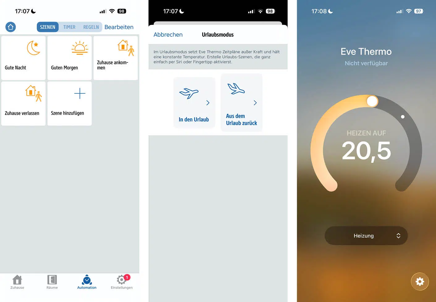 Zeitpläne gibt es bereits voreingestellt, jedoch kann man auch eigene hinzufügen. Man kann dem Zeitplan einen Namen geben, an welchen Wochentagen er aktiviert werden soll, und natürlich die Zeiträume und die passende Temperatur einstellen. Die Temperatur kann sowohl händisch, als auch mit einem vorgestellten Modus eingestellt werden. Zudem gibt es auch Automationen, wie den Urlaubsmodus oder die Fenster-offen-Erkennung. Diese können die Temperatur passend einstellen. Alle Einstellungen können auch in der HomeKit-App eingesehen werden.
