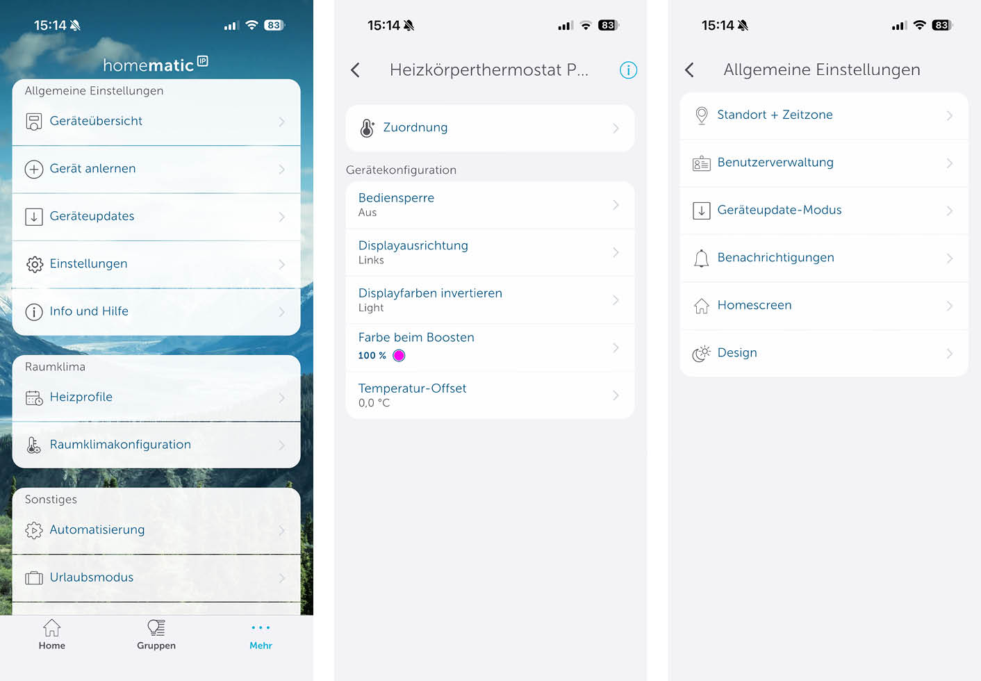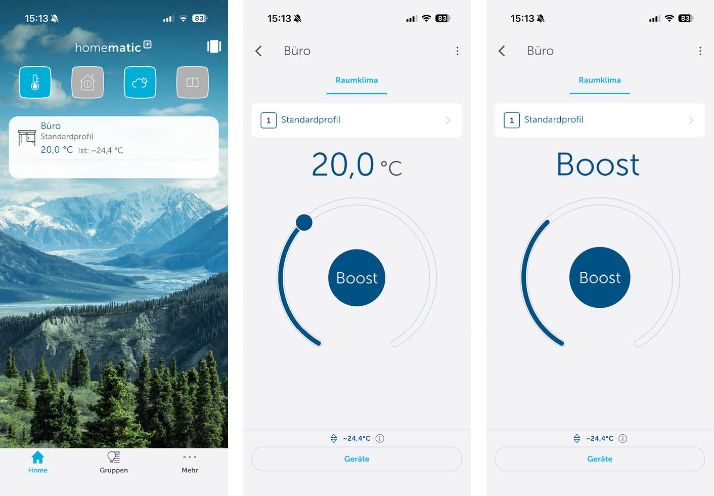 Die Bedienung über die App ermöglicht einem noch weitere Funktionen und Einstellungen. Auf der Startseite sieht man die eigenen Geräte, den momentanen Betriebsmodus, das momentane Wetter und, wenn ein Fenster oder Türkontakt angelernt ist, ob eines der zuvor Genannten geöffnet ist. Außerdem ist es Möglich die Raumtemperatur oder einen Boost über die App einzustellen.