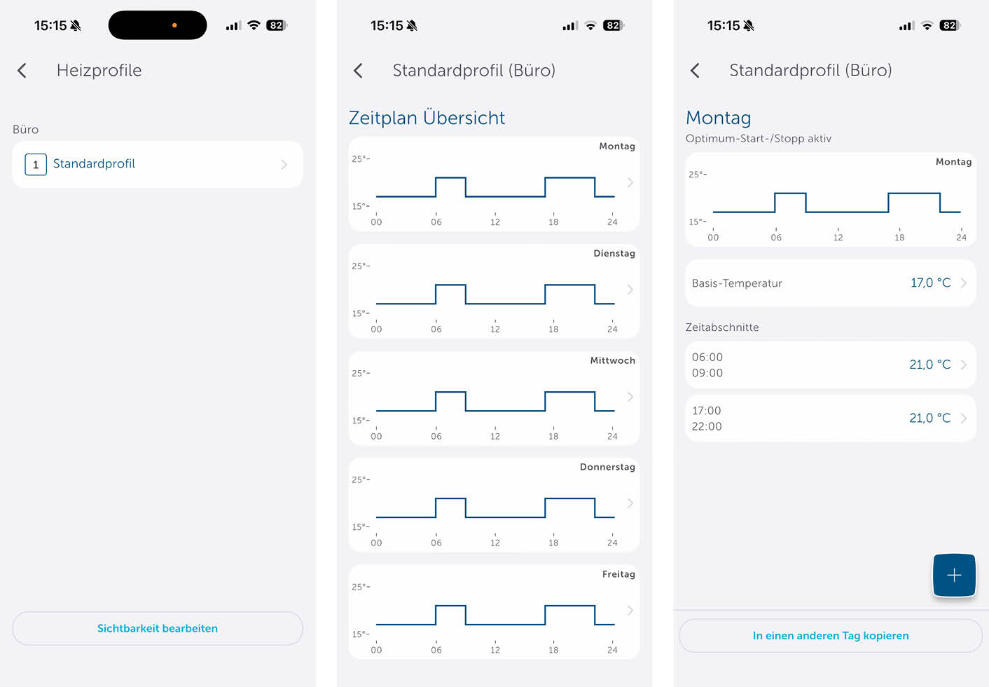 Im Raumklima können Heizprofile erstellt oder die Raumklimakonfigurationen vorgenommen werden. Heizprofile sind Zeitpläne, die nach Wochentagen eingerichtet werden können. Dort kann dann individuell eine Basis-Temperatur und Zeitabschnitte, in denen die Temperatur abweicht, eingestellt werden.