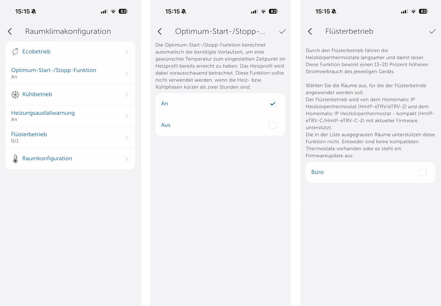 In der Raumklimakonfiguration können Einstellungen zum Eco-Betrieb, der Optimum-Start-/Stopp-Funktion oder dem Flüsterbetrieb getätigt werden. Die Optimum-Start-/Stopp-Funktion beispielsweise berechnet automatisch die benötigte Vorlaufzeit, um eine gewünschte Temperatur zum eingestellten Zeitpunkt im Heizprofil bereits erreicht zu haben.