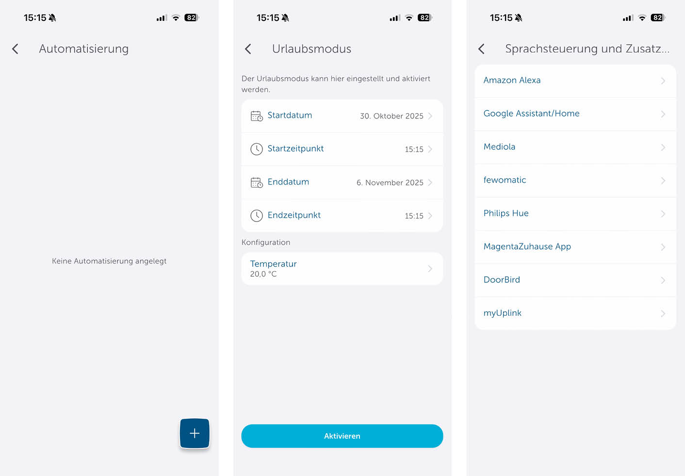 Im Einstellungsbereich „Sonstiges“ findet man Automatisierungen, die mit anderen Smarthome-Geräten verknüpfen kann. Im Urlaubsmodus kann ein Start- und Endzeitpunkt eingestellt werden und die gewünschte Temperatur. Zudem findet man noch Einstellungen zur Sprachsteuerung, der Multi-Home-Verwaltung und dem Ereignisprotokoll.