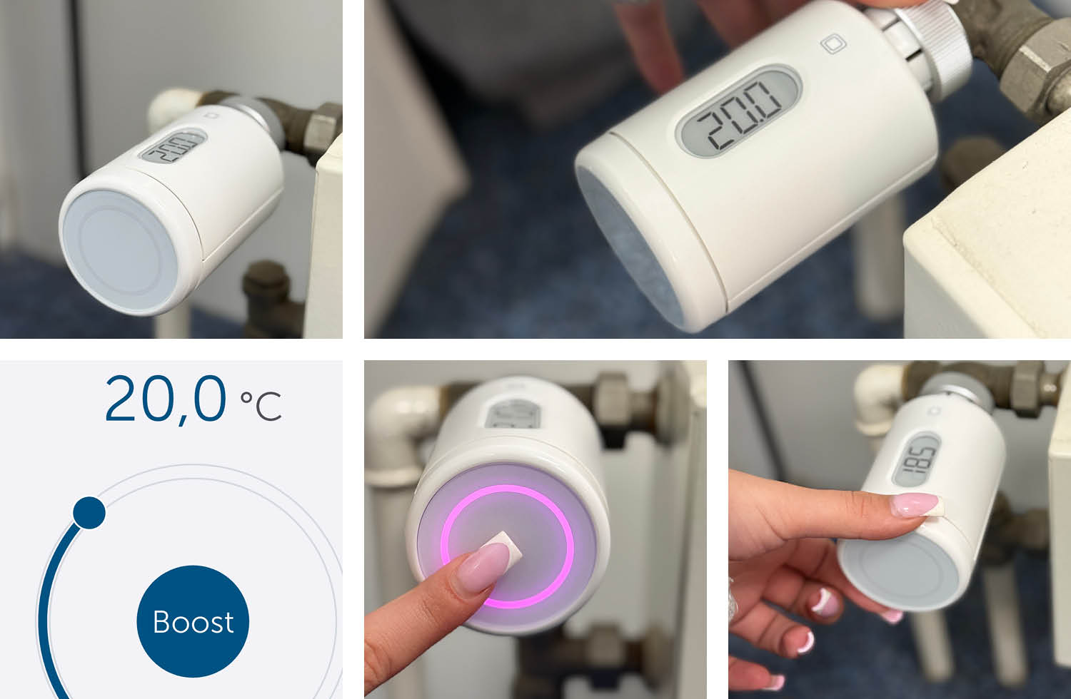 Das Thermostat lässt sich manuell sehr einfach und intuitiv bedienen. Durch Drehen kann die Temperatur in 0,5 Grad-Schritten verstellt werden. Auf der Anzeige wird einem immer die aktuell eingestellte Temperatur angezeigt und man muss nicht in Stufen heizen. Eine weitere Funktion ist der Boost. Durch ein einmaliges Drücken auf der Vorderseite des Heizkörperthermostates kann ein Boost ausgelöst werden. Während des Boosts wird das Ventil des Thermostates vollständig geöffnet, um den Heizkörper schneller aufzuheizen. Die Boost-Dauer kann in der App festgelegt werden.