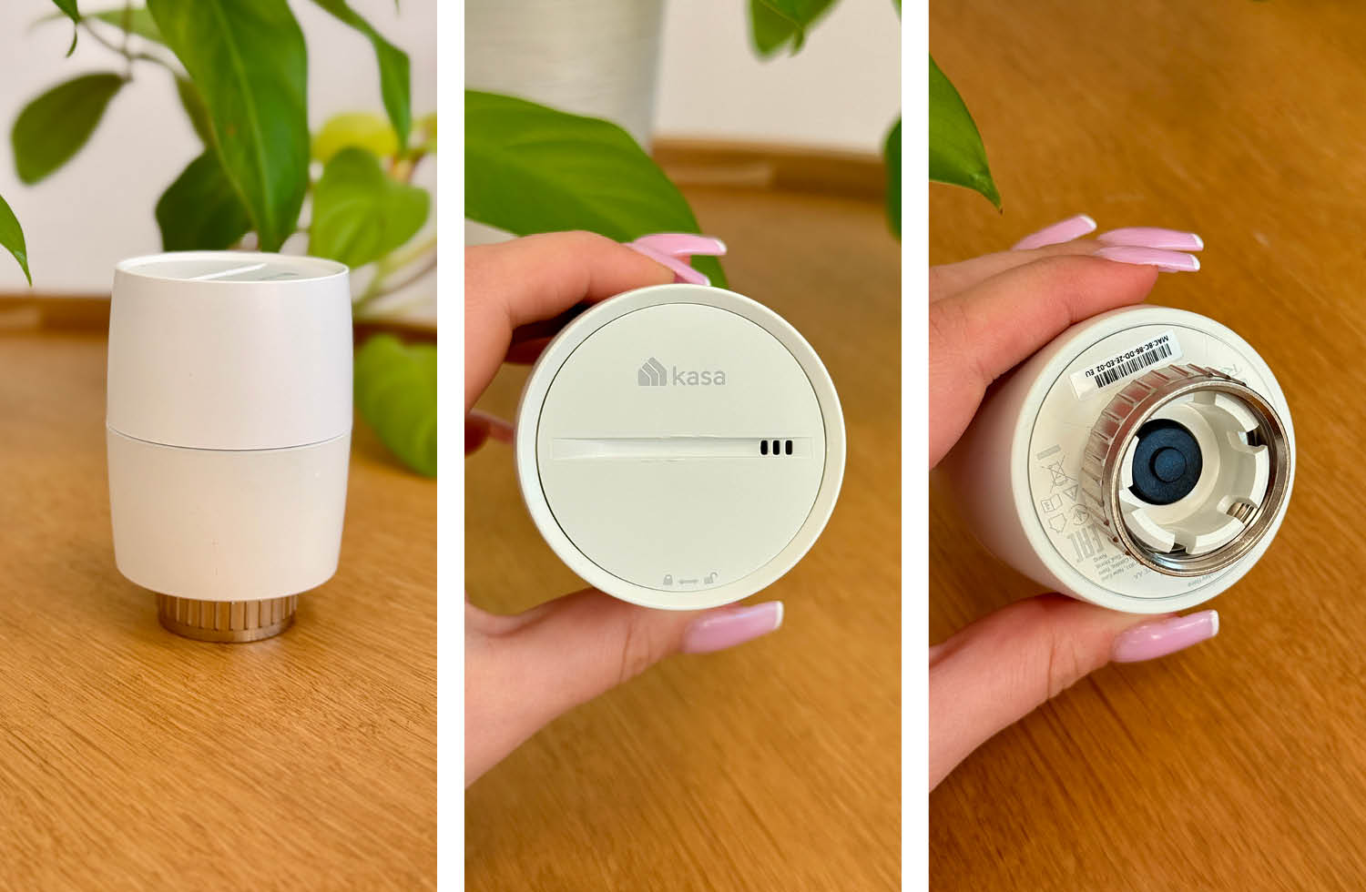 Optisch bleibt das Kasa KE100 sehr schlicht. Das Thermostat ist komplett in Weiß gehalten und trägt auf der Front das Kasa-Logo. Auf der Oberseite befindet sich ein kleines Display, auf dem die aktuelle Temperatur angezeigt wird. Die Temperatur wird über ein Drehrad eingestellt. Dieses bietet ein deutliches haptisches Feedback, wodurch sich Einstellungen angenehm präzise vornehmen lassen. Auf der Rückseite befindet sich die klassische Überwurfmutter zur Befestigung am Heizkörper.