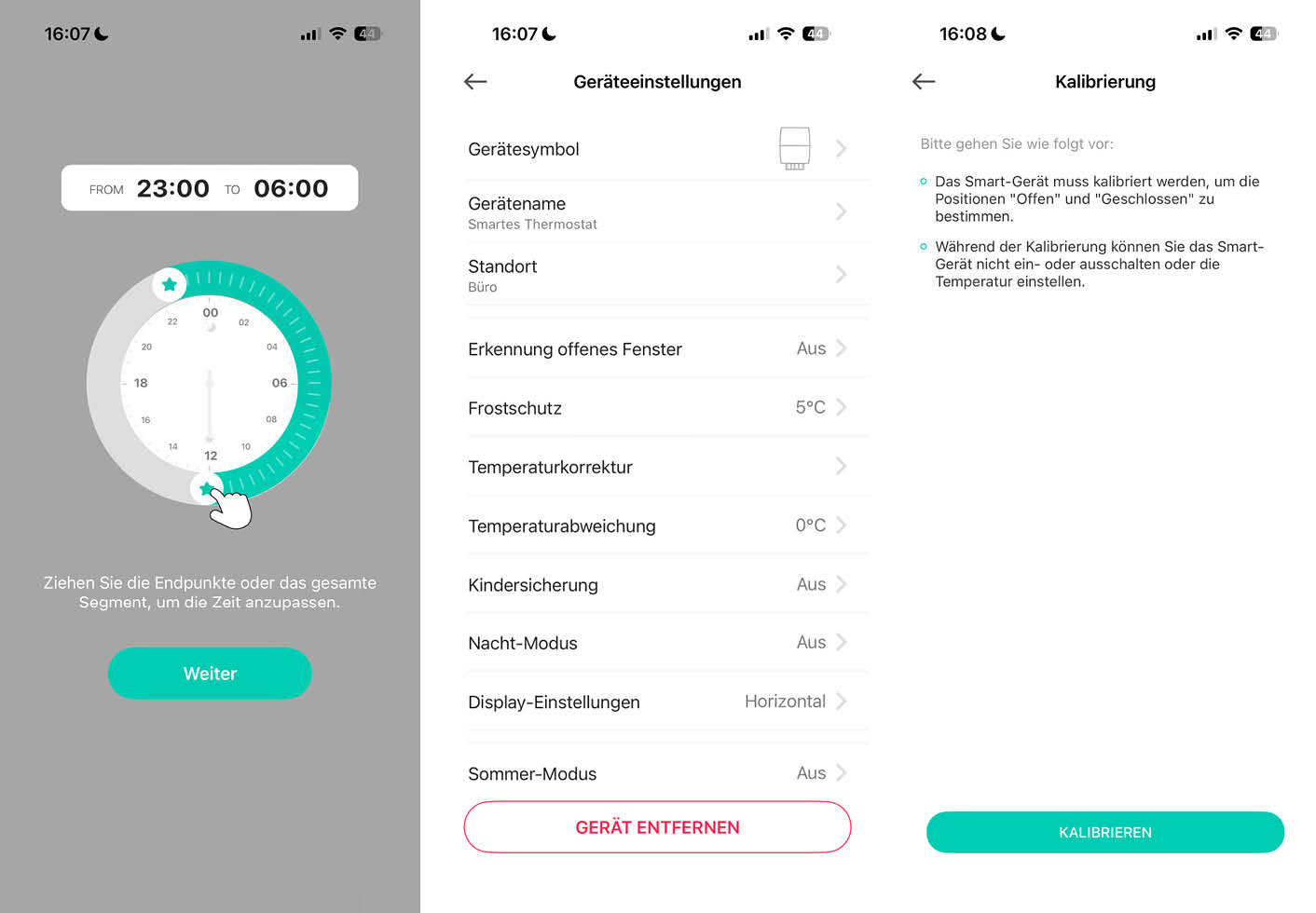 Darüber hinaus bietet die App weitere Funktionen wie einen Frostschutzmodus, eine Kindersicherung, einen Nachtmodus sowie die Möglichkeit zur Kalibrierung der Temperatur. Auch Display-Einstellungen lassen sich anpassen, außerdem kann das Thermostat bestimmten Räumen zugeordnet und mit individuellen Symbolen versehen werden. Eine Fenster-offen-Erkennung ist ebenfalls vorhanden, funktioniert jedoch nur in Verbindung mit einem kompatiblen Fensterkontakt und nicht über einen automatischen Temperaturabfall.