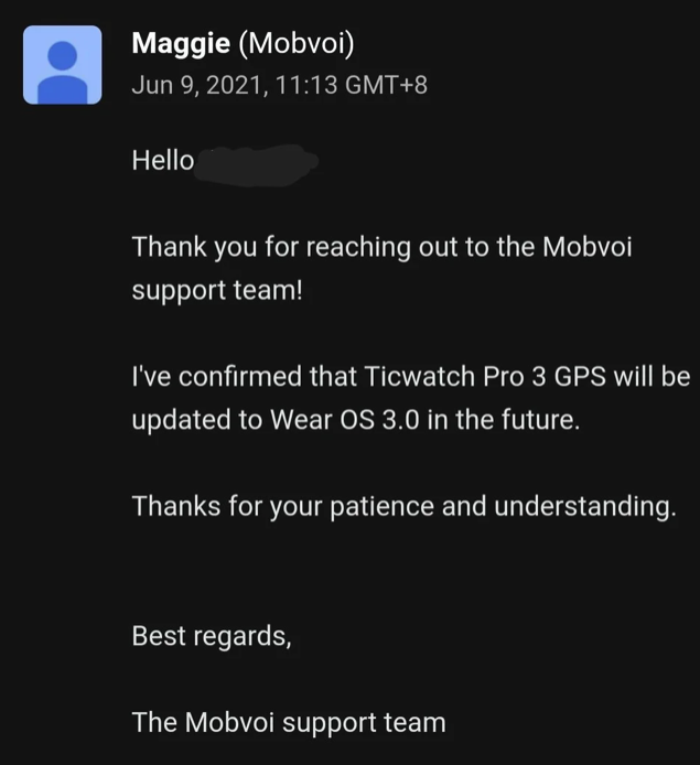 Ein Mitarbeite von Mobvoi hat auf eine Supportanfrage hin bestätigt, dass die Ticwatch Pro 3 Wear OS 3.0 erhalten wird.