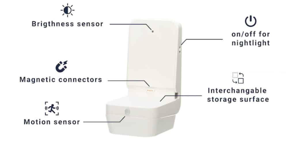 Die weiße Basisstation ist mit einem Bewegungs- und Helligkeitssensor ausgestattet und kann somit auf Wunsch ein Nachtlicht aktivieren, sobald Bewegung erkannt wurde.