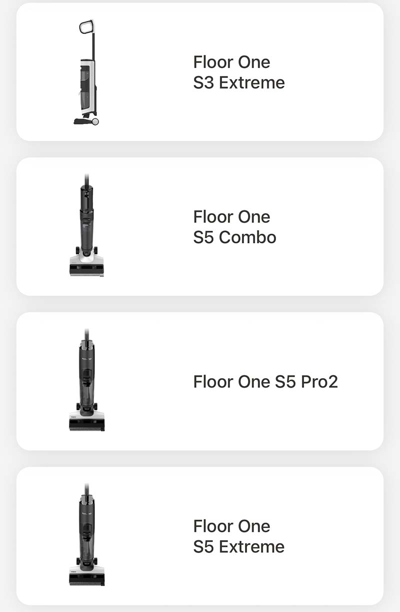 Inzwischen scheint Tineco einige Upgrades in der Pipeline zu haben, denn in der Tineco-App werden neue Geräte für die Einrichtung angezeigt. Hier sieht man einen Tineco Floor One S3 Extreme und auch einen Floor One S5 Extreme.