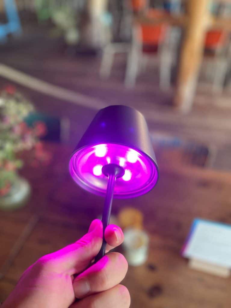 Wie man auf den Bildern erkennen kann, wird Licht sowohl nach unten als auch nach oben wiedergegeben. Neben warm- und kaltweißem Licht ist auch die Wiedergabe von farbigem Licht möglich. An der Oberseite befindet sich eine Touch-Bedienfläche zum ein- und ausschalten der Tischleuchte. Wer auf die smarte Steuerung verzichten möchte, kann alternativ auch eine Fernbedienung von tint verwenden.