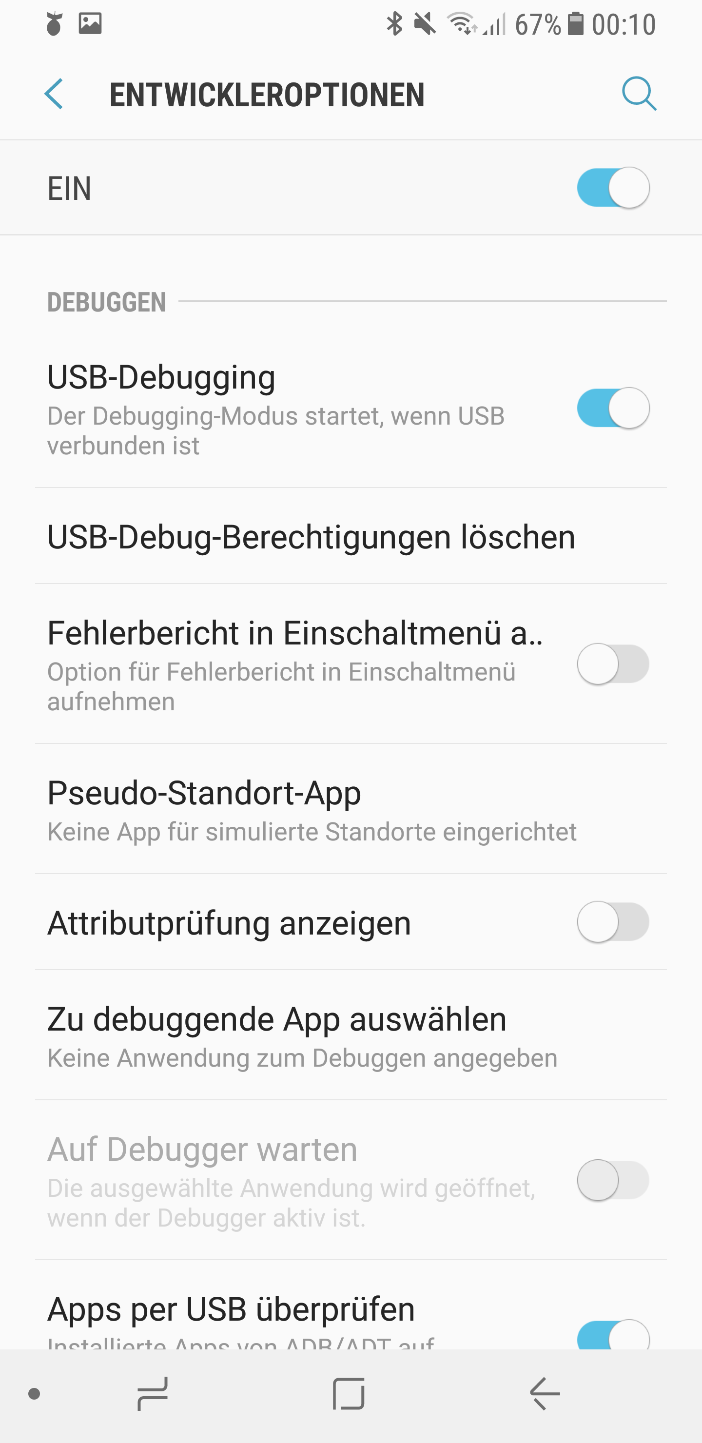 - Öffnet ihn, aktiviert ihn und scrollt weiter runter bis zu dem Punkt „USB Debugging“. Aktiviert auch diesen Punkt.