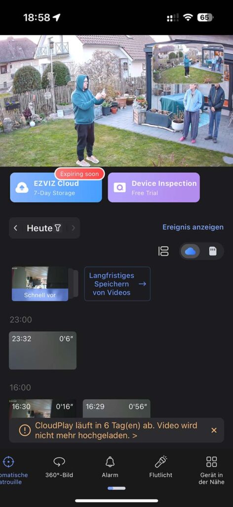 Die App selbst bietet zahlreiche Funktionen. Ich persönlich finde sie ein klein wenig überladen, was zum Start manchmal dafür sorgte, dass ich verschiedene Funktionen erst suchen musste. In erster Linie hat man aber natürlich Zugriff auf das Livebild und die erkannten Bewegungen, welche entweder auf einer microSD-Karte oder in der kostenpflichtigen Cloud gespeichert werden. Zum Start hat man für die Cloud jedoch noch eine kostenlose Testversion, sodass man diese vorerst ausprobieren kann.