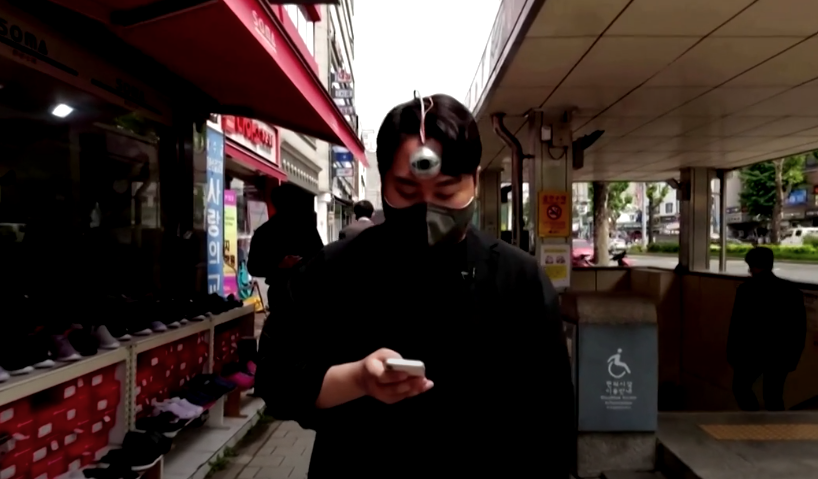 Ein Designer aus Korea ist dieses Problem nun satirisch angegangen und hat eine Art drittes Auge mit Ultraschallsensor und Gyroskop entwickelt. Dieses wird wie eine Stirnlampe am Kopf befestigt und öffnet sich, sobald der Nutzer nach unten schaut. Ab dann überwacht der Ultraschallsensor den Bereich vor dem Nutzer und vibriert, sobald ein Hindernis erkannt wird.