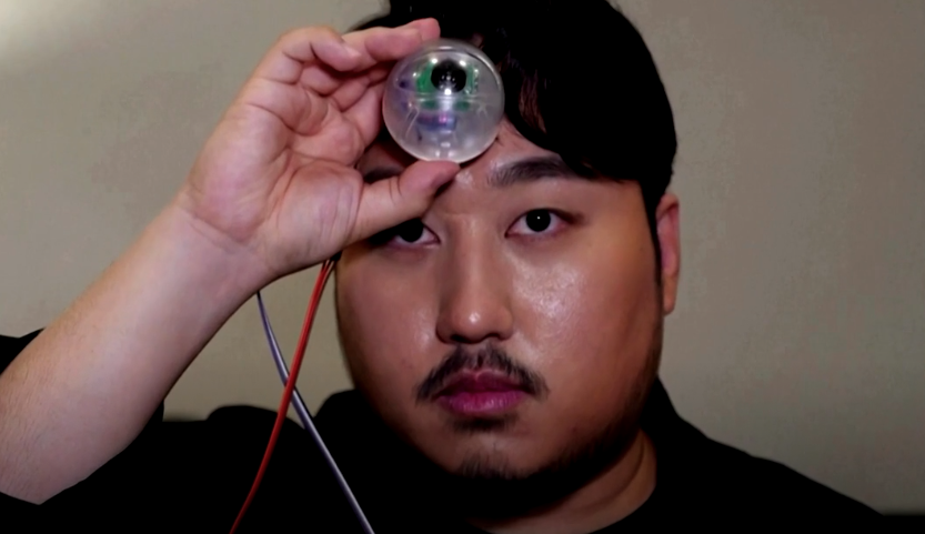 Ein Designer aus Korea ist dieses Problem nun satirisch angegangen und hat eine Art drittes Auge mit Ultraschallsensor und Gyroskop entwickelt. Dieses wird wie eine Stirnlampe am Kopf befestigt und öffnet sich, sobald der Nutzer nach unten schaut. Ab dann überwacht der Ultraschallsensor den Bereich vor dem Nutzer und vibriert, sobald ein Hindernis erkannt wird.