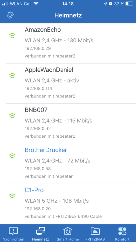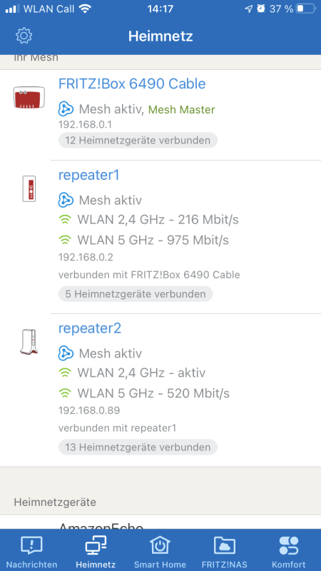 Für alle die mindestens einen Repeater oder eine weitere FritzBox im Mesh betreiben, ist nun ein Update im AppStore vorhanden. Auf dem Register „Heimnetz“ wird nun als erstes die FritzBox und weitere Repeater grafisch dargestellt. Im Mesh Verbund kann man hier nun sehen, welcher Repeater wie ins Mesh Netzwerk eingebunden ist. Auch an jedem einzelnen Netzwerk Gerät steht nun, mit welchem Gerät es verbunden ist.