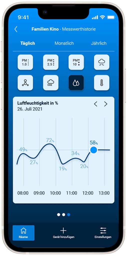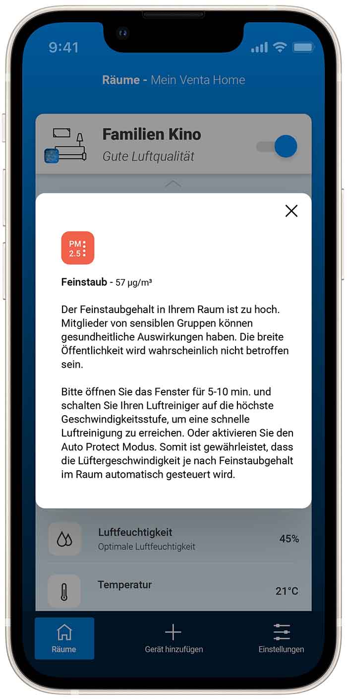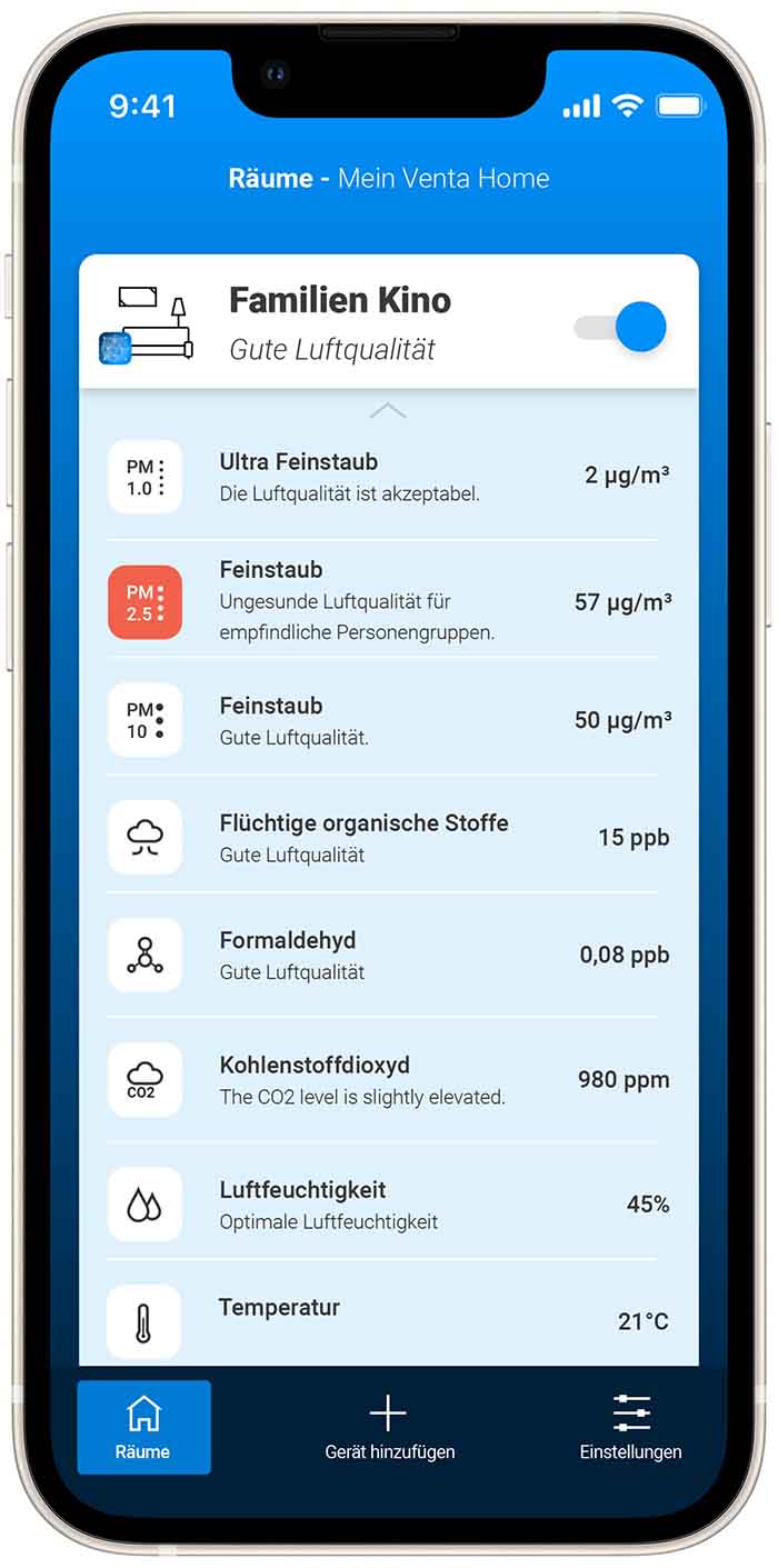 Für die Venta Home bringt ein Update neue Funktionen dazu, welche die App zum Berater für die Raumluft macht. Die von den Geräten übermittelten Werte können nun in der App eingesehen werden. Dazu gehört Feinstaub in drei Größen, CO2, VOCs (Gase), Formaldehyd, die Luftfeuchtigkeit und die Temperatur.