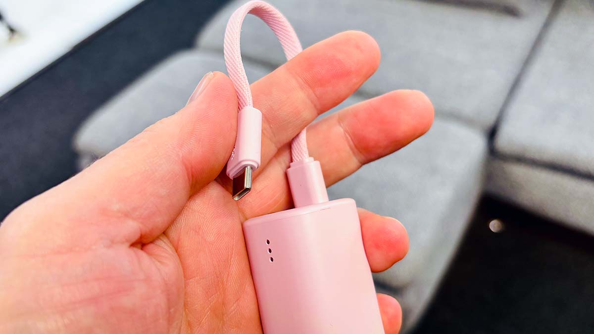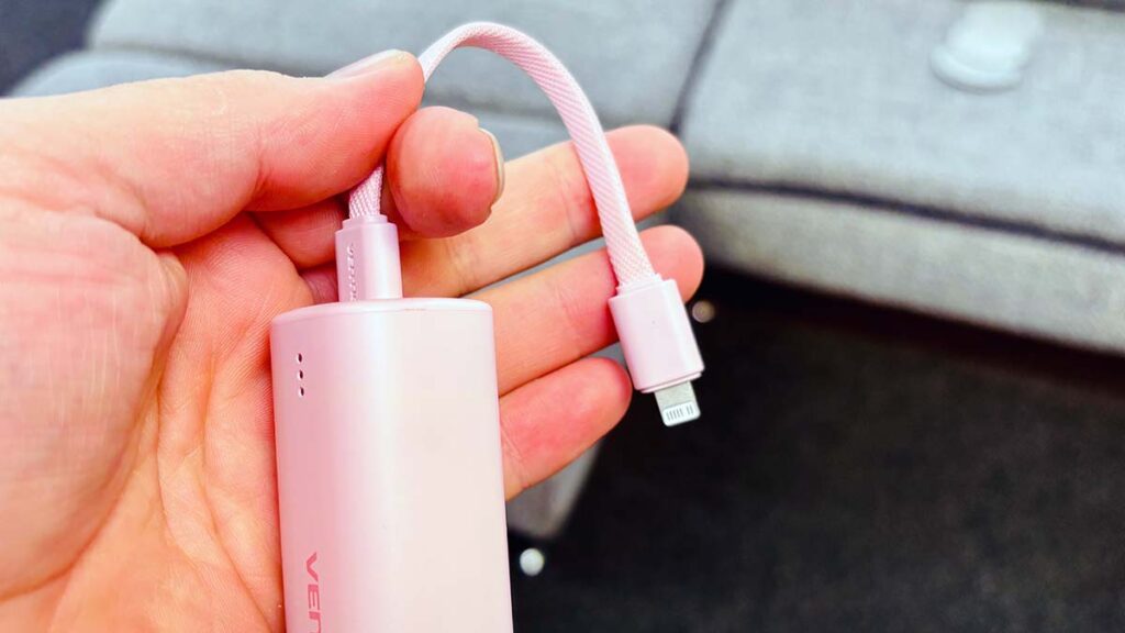 Mit der Kapazität von 5.000 mAh lässt sich ein aktuelles iPhone etwa ein Mal wieder komplett laden. Das Ladekabel dient gleichzeitig als Tragelasche, welche man so zum Beispiel auch an einer Tasche befestigen kann. Die Power Bank hat einen USB-C und einen Lightning-Anschluss. Mit dem Kabel, welches auch auf jeder Seite einen der beiden Anschlüsse besitzt, kann man so eine Vielzahl von Geräten bedienen.