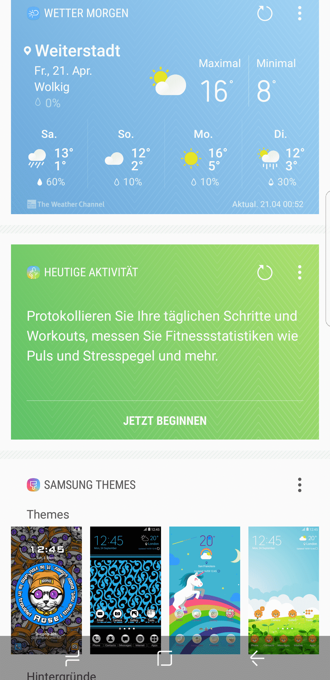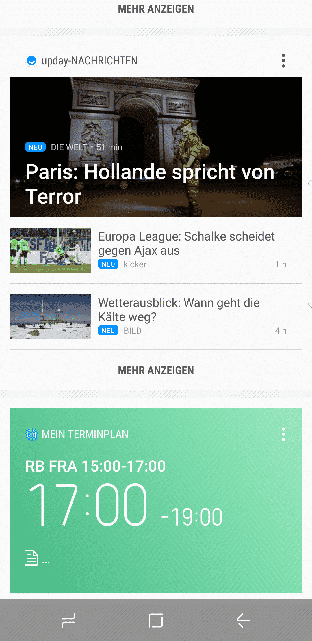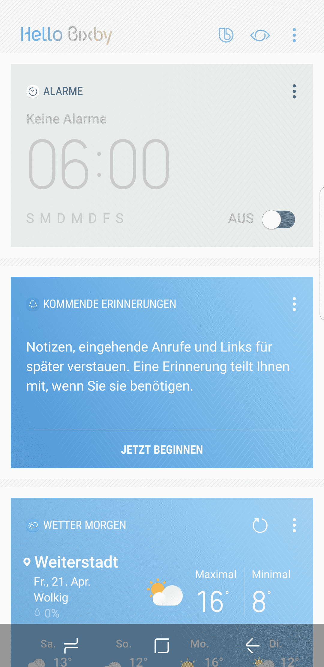 Gibt man Bixby die Berechtigungen, dann greift sie auch auf die unterschiedlichsten Daten zu. So kann sie die nächsten Termine, das Wetter oder den Verkehr zur Arbeit anzeigen. Dargestellt wird das ganze in Tabs, die untereinander angezeigt werden. Einen wirklichen Mehrwert anderen Assistenten gegenüber, habe ich hier aber noch nicht feststellen können.