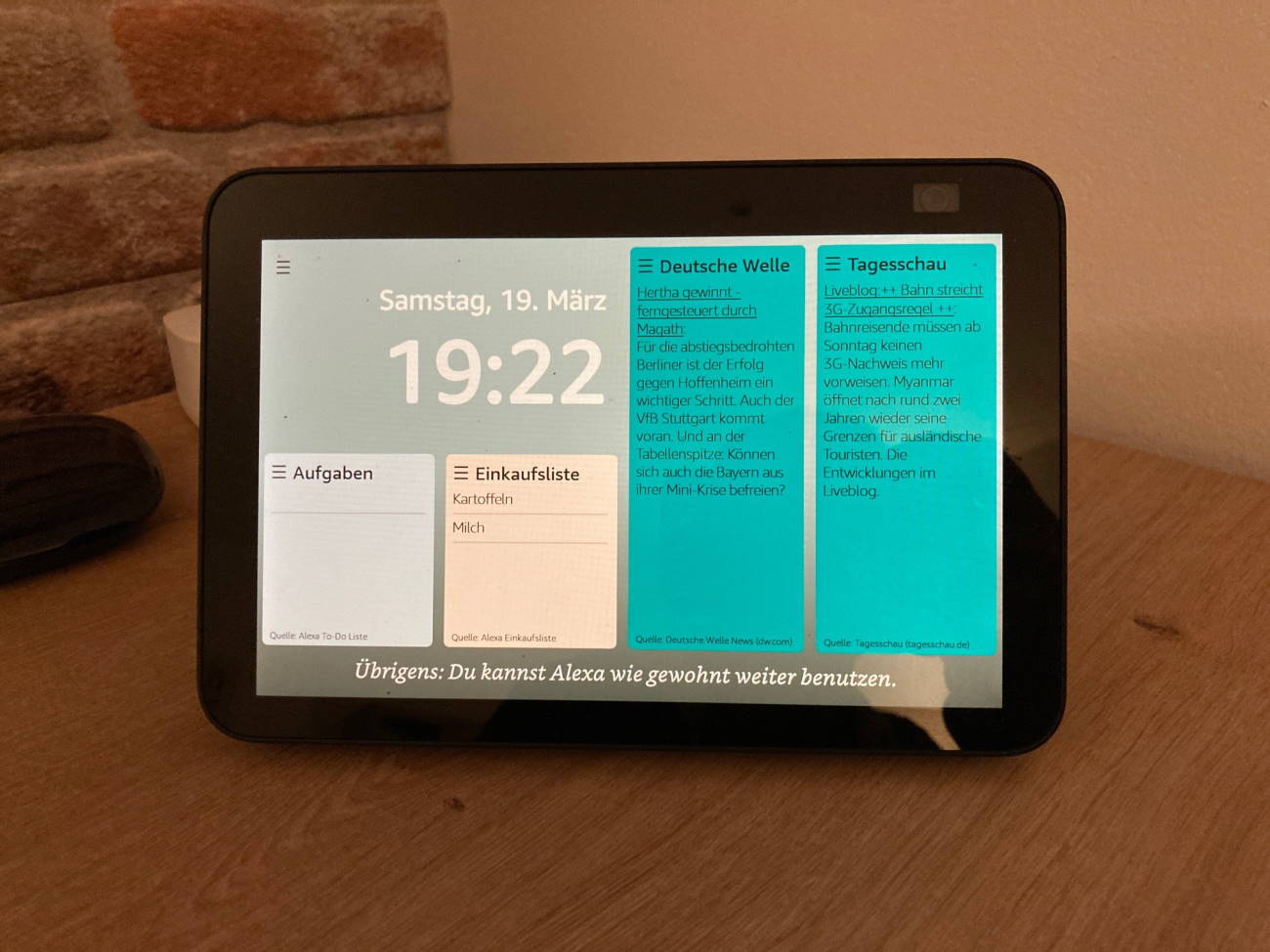 Wenn du im Besitz eines Echo Show oder Fire Tablets bist, dann schau dir doch mal den Alexa Skill „Mein Dashboard“ an. Dieser stammt nicht von Amazon sondern von einem privaten Entwickler. Er stellt viele Informationen auf eine Art und Weise zur Verfügung, die den neuen APL Widgets ähnelt. Das gute daran ist, das Alexa weiterhin für allgemeine Fragen benutzt werden kann. Nachteil: Alle Befehle, die eine Bildausgabe erfordern, beenden die Anzeige leider.