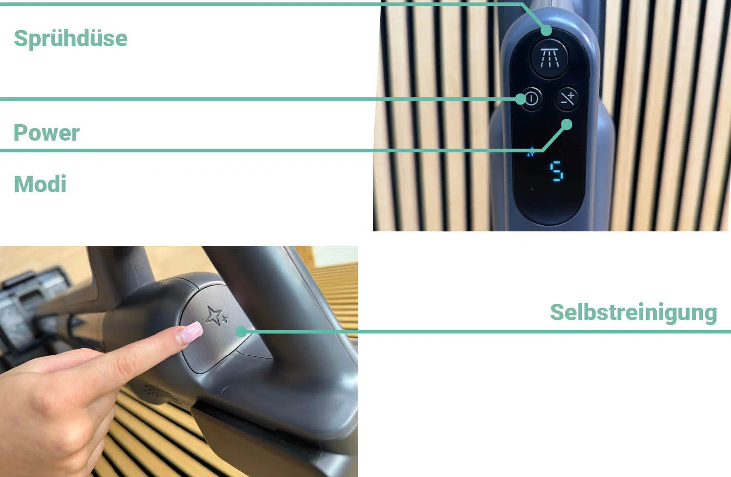 Die Bedienung erfolgt bei beiden Modellen gleich, da das Handteil immer benötigt wird. Der Power-Knopf ist zum Ein- und Ausschalten des Gerätes zuständig. Um die Modi umzuschalten, muss der Knopf daneben betätigt werden. Der größere und mittige Knopf ist zur Aktivierung des Sprühstoßes. Zuletzt kommt ein etwas versteckter Button: Dieser befindet sich unterhalb des Griffes und beim Betätigen startet die Selbstreinigungsfunktion in der Basisstation.