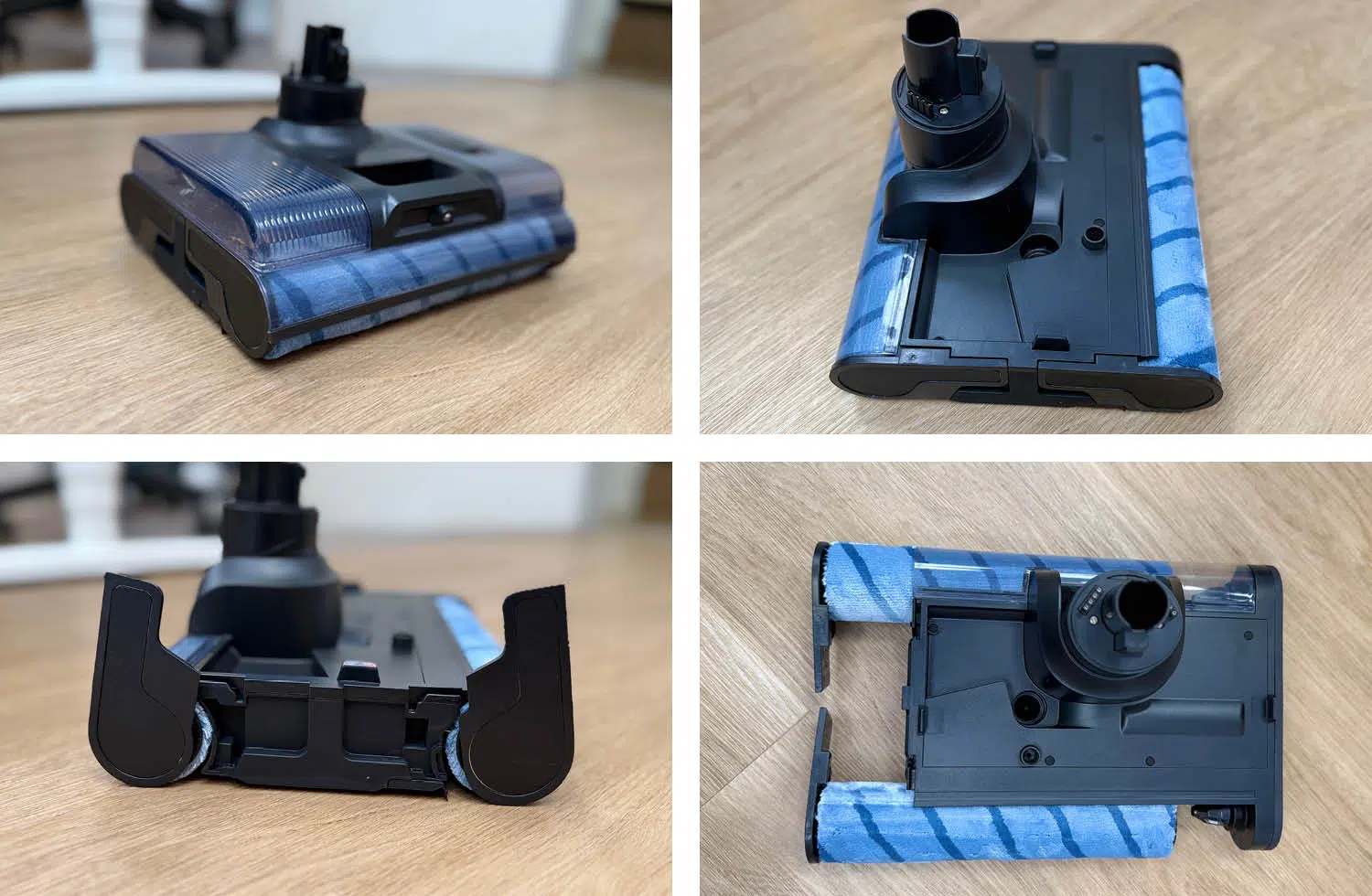 Die Bodendüse ist durch den Frischwassertank geschützt und hat in diesem Fall keine extra Abdeckung. Um die Rollen zu entnehmen, kann man den Tank abnehmen, aber auch dranlassen, denn die Rollen lassen sich seitlich herausziehen. Dafür müssen seitlich zwei Hebel nach oben gezogen werden, und schon können die Bürsten entnommen werden. Praktisch ist hier auch eine kleine Düse, die Wasser abgibt.