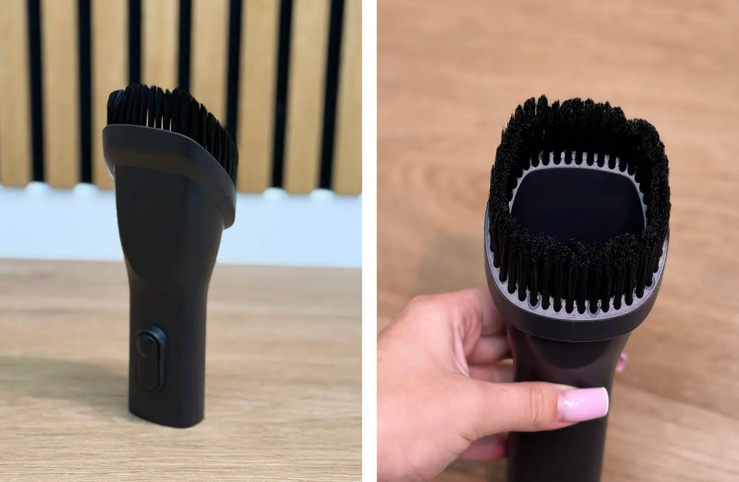 Die Fugendüse ist klassisch gehalten und eignet sich vor allem für schwer erreichbare Bereiche wie Sofaritzen, Ecken, Sockelleisten oder Zwischenräume im Auto. Durch ihre schmale Bauform gelangt sie auch in enge Spalten, in die die normale Bodendüse nicht kommt.