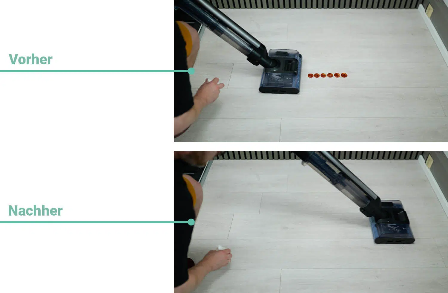 Um die Saugleistung des Akkusaugers zu testen, wird eine gleiche Menge an Schmutz auf Hart- und Teppichboden verteilt. Hierfür hat der Sauger dann eine Minute Zeit, den Schmutz bei gleichbleibender Bewegung aufzunehmen.