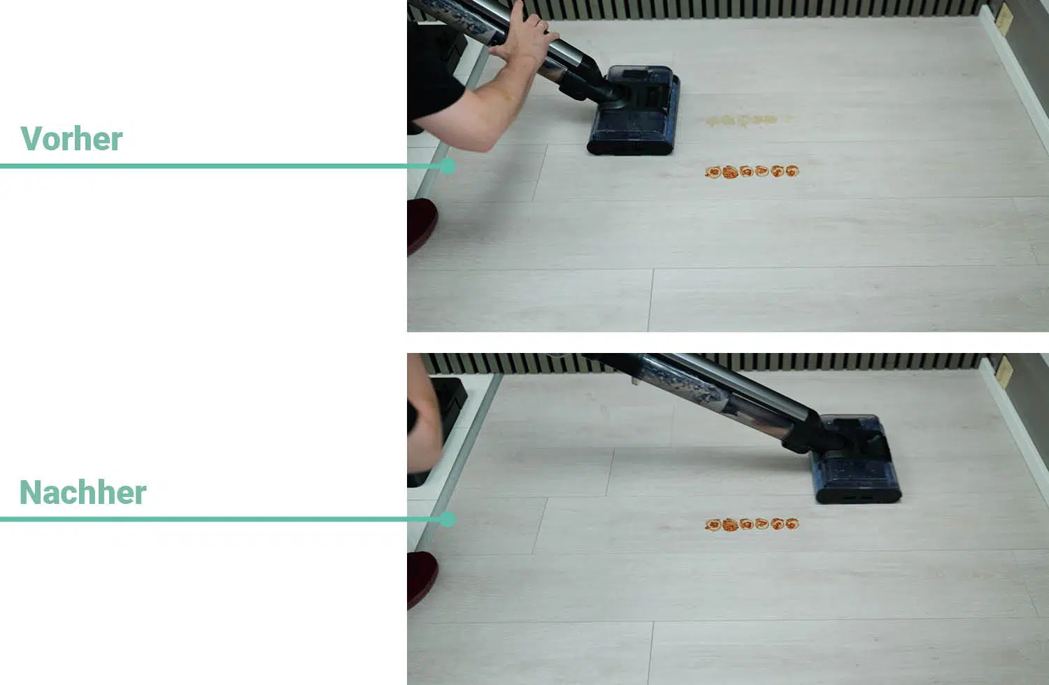 Anschließend musste er über festgetrockneten Ketchup. Hierfür hat er sechs Überfahrten benötigt, was ein überdurchschnittlich gutes Ergebnis ist. Insgesamt hat der AEG 8000 3-in-1 WET&DRY als Wischsauger eine überdurchschnittliche Reinigungsleistung vorgewiesen. Das kann natürlich an den zwei Bürstenrollen, als auch an der Sprühdüse liegen, die hier zu einem so guten Ergebnis verholfen haben.