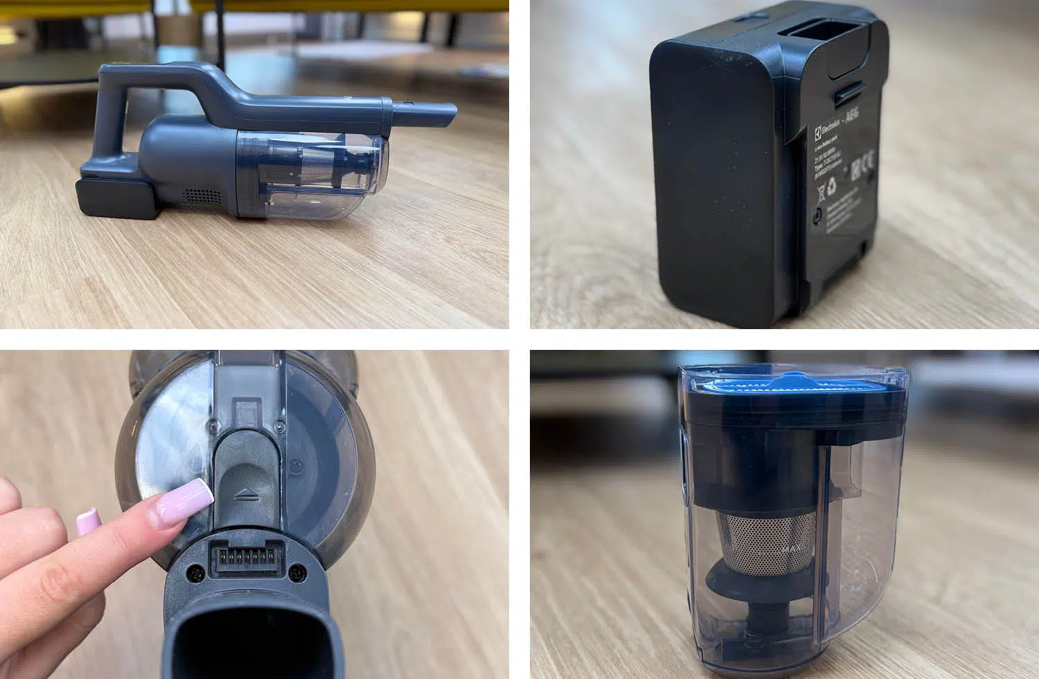Wie bereits erwähnt, hat der AEG 8000 3-in-1 WET&DRY einen Akku für beide Geräte. Die Saugeinheit ist schlicht, aber schön gestaltet. Den Staubauffangbehälter kann man mit einem Knopfdruck an der Unterseite leicht entfernen und entleeren. In dem Staubauffangbehälter befindet sich noch zwei Filter: ein Vorfilter undd einen weiteren Filter.