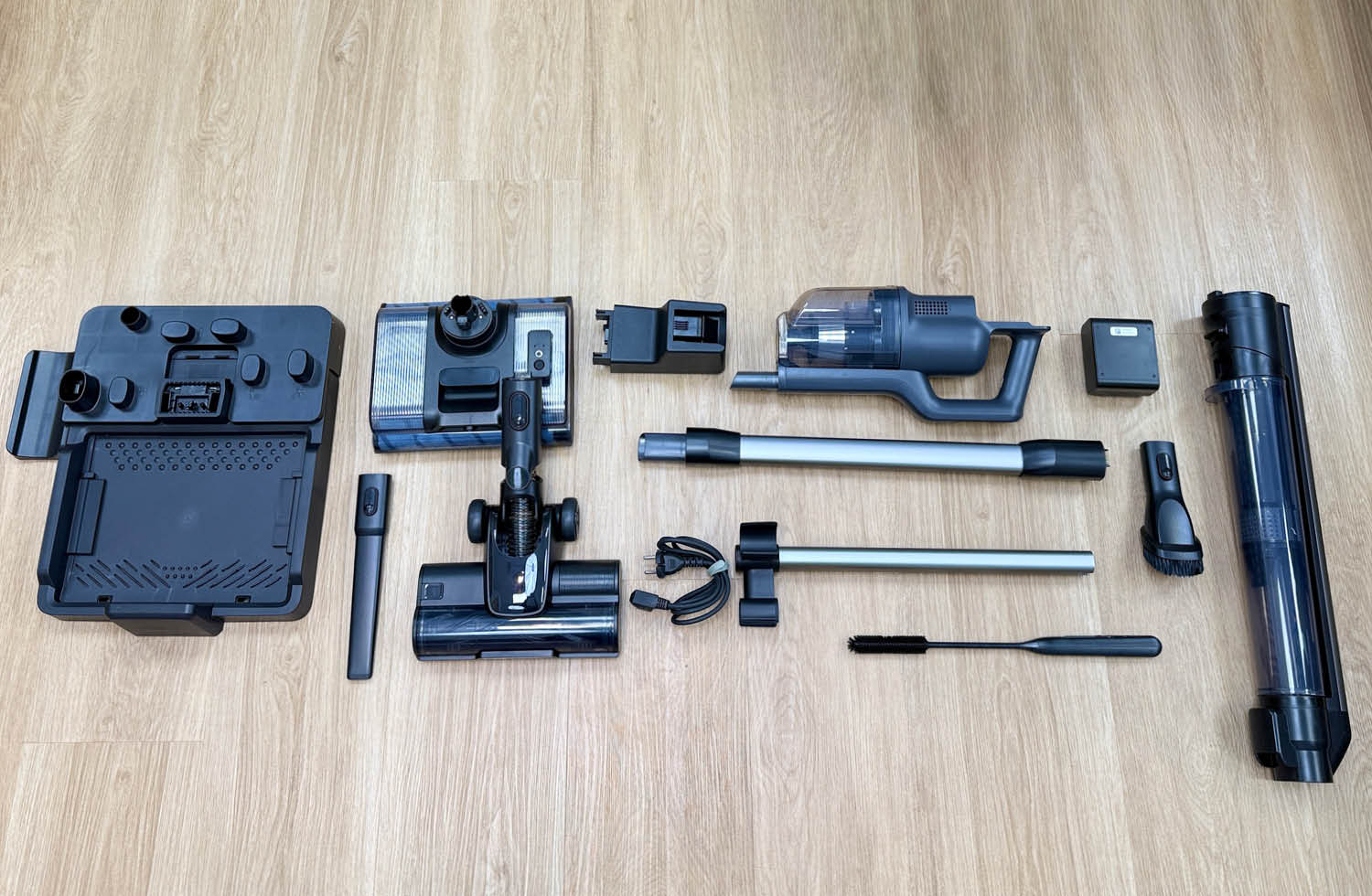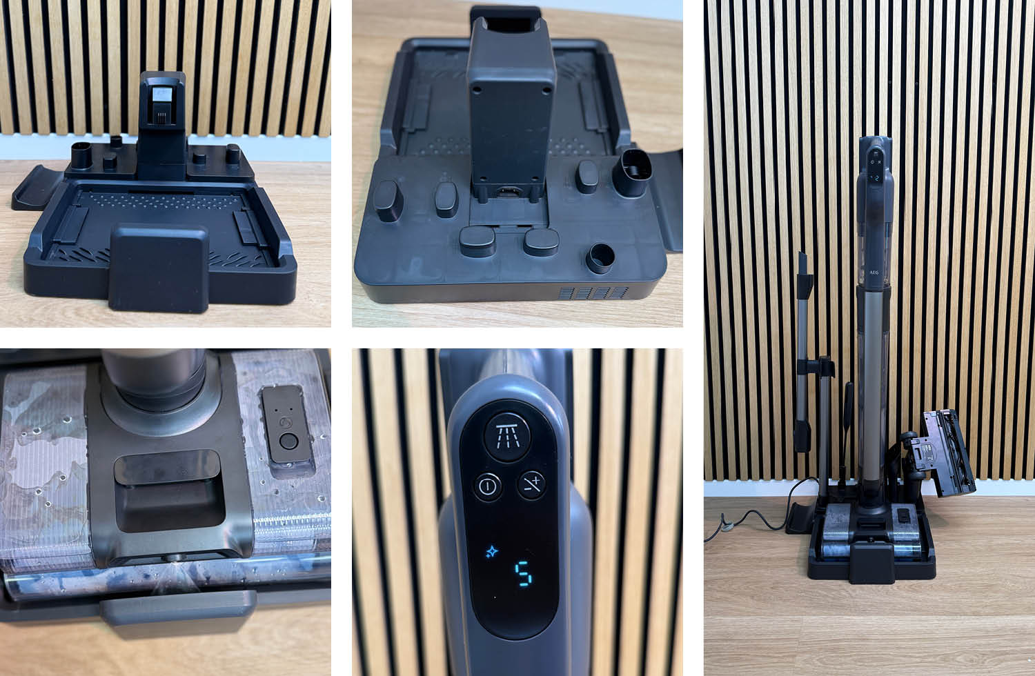 Die Basisstation des AEG 8000 3-in-1 WET&DRY hat nicht nur Platz, um alles zu verstauen, sondern lädt das Kombigerät auf. Zudem kommt noch eine Selbstreinigungsfunktion im Wischsauger-Modus. Diese reinigt zwar nicht mit heißem Wasser, wie viele moderne Geräte, aber sie funktioniert trotzdem ganz gut. Auch ist eine Bürstentrocknung verfügbar, die jedoch drei Stunden Zeit in Anspruch nimmt. Insgesamt eine praktische Basisstation, die für jeden Aufsatz einen passenden Platz hat.