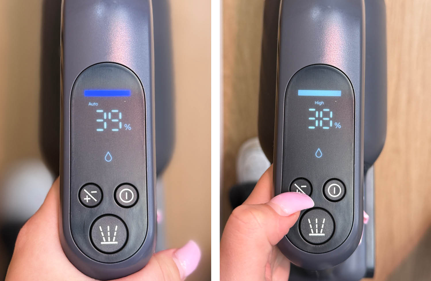 Die Bedienung erfolgt bei beiden Modellen gleich, da das Handteil immer benötigt wird. Der Power-Knopf ist zum Ein- und Ausschalten des Gerätes zuständig. Um die Modi umzuschalten, muss der Knopf daneben betätigt werden. Der größere und mittige Knopf ist zur Aktivierung des Sprühstoßes. Zuletzt kommt ein etwas versteckter Button: Dieser befindet sich unterhalb des Griffes und beim Betätigen startet die Selbstreinigungsfunktion in der Basisstation.