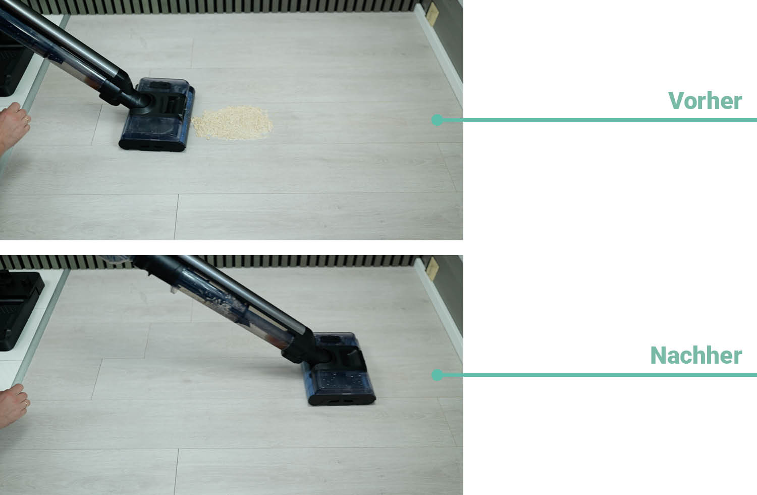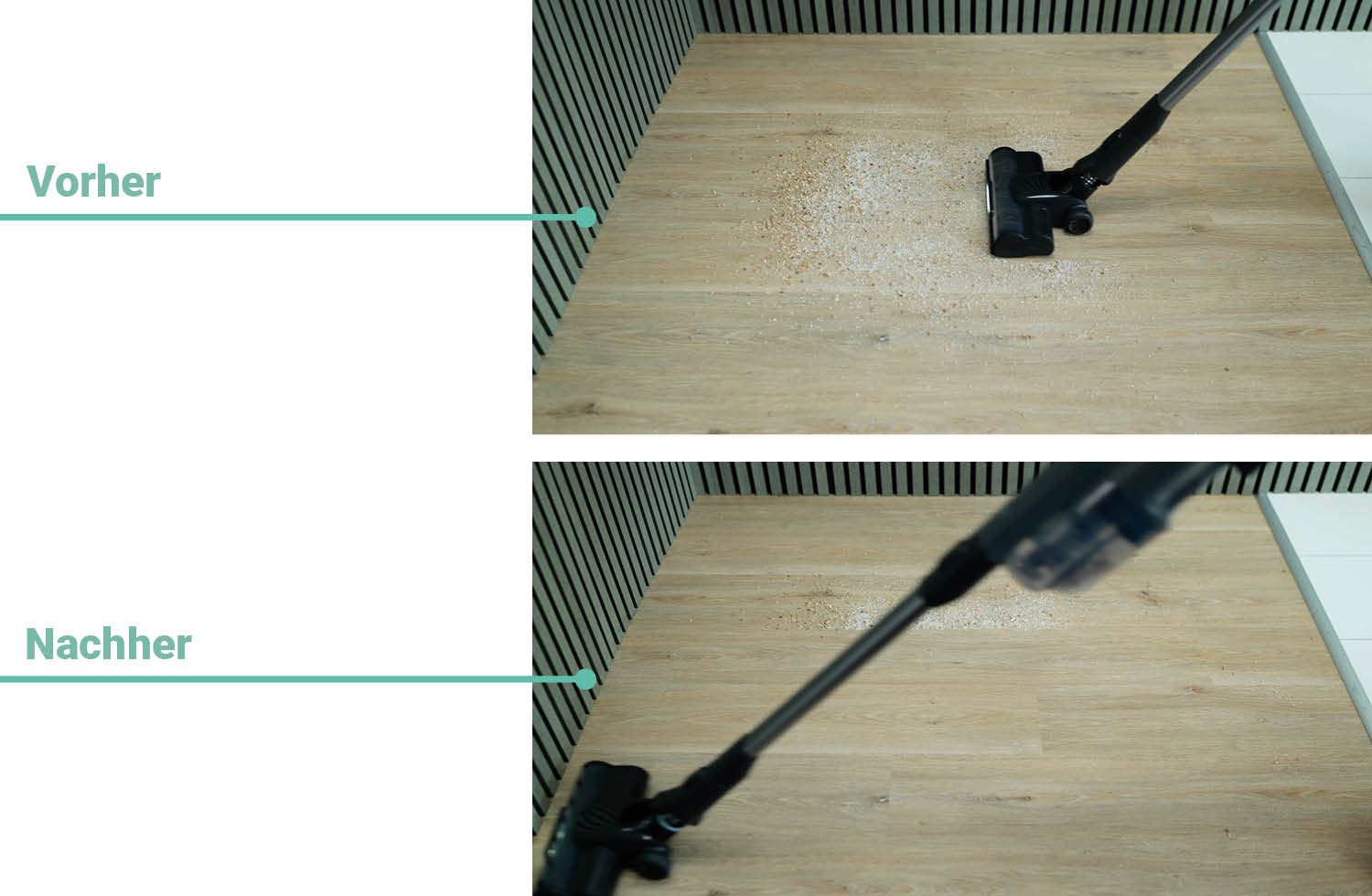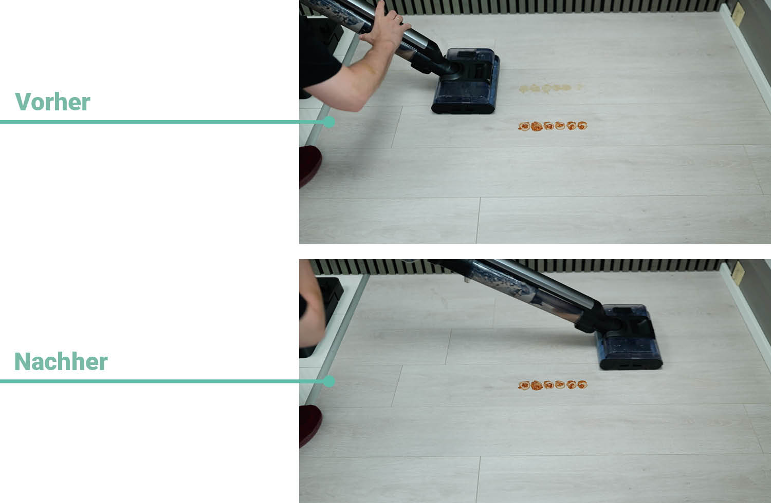 Um die Saugleistung des Akkusaugers zu testen, wird eine gleiche Menge an Schmutz auf Hart- und Teppichboden verteilt. Hierfür hat der Sauger dann eine Minute Zeit, den Schmutz bei gleichbleibender Bewegung aufzunehmen.