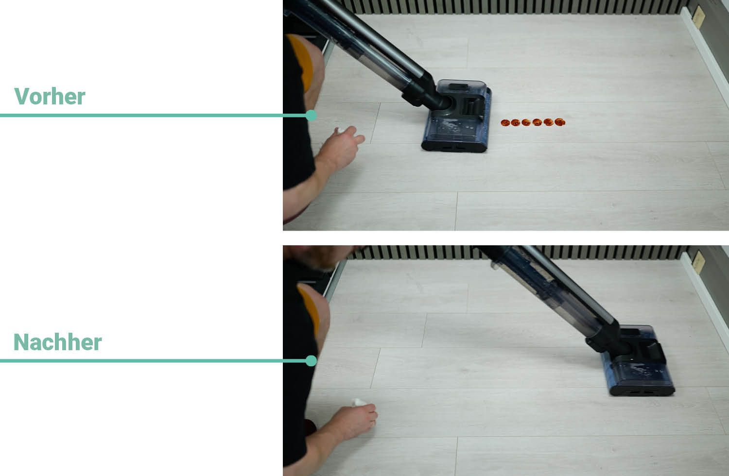 Um die Reinigungsleistung verschiedener Wischsauger zu vergleichen, testen wir sie immer unter gleichen Bedingungen. Diese bestehen aus flüssigen, dickflüssigen und vertrockneten Flüssigkeiten auf Hartboden. Wie oft ein Wischsauger über die Verschmutzung fahren muss, bis sie vollständig entfernt ist, ist dabei ausschlaggebend.