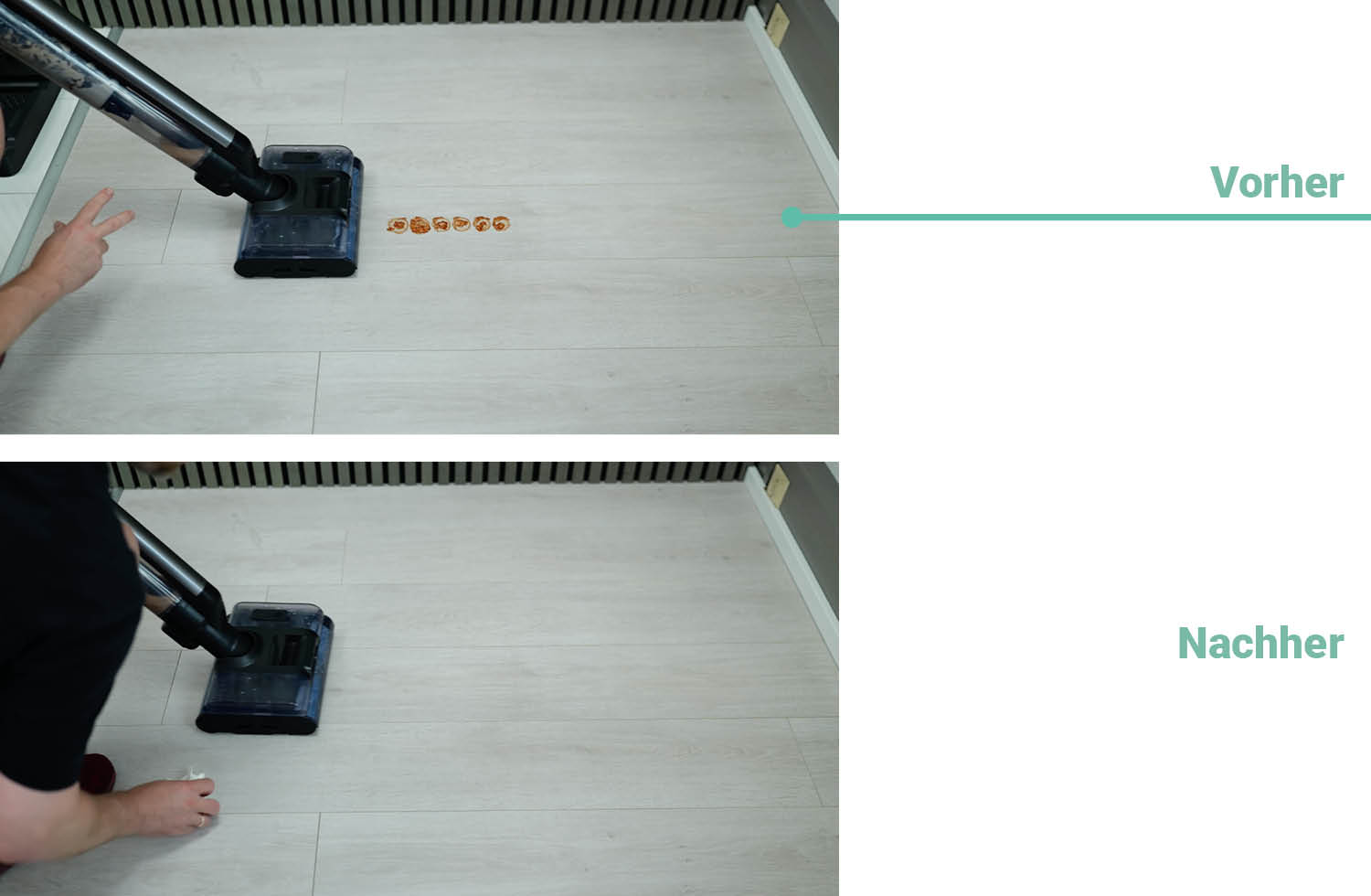 In den letzten beiden Testdurchläufen muss der Wischsauger über vertrocknete Verschmutzungen. Zuerst musste er den getrockneten Kaffee entfernen, und das hat er auch wieder nach nur einer Überfahrt erfolgreich geschafft.