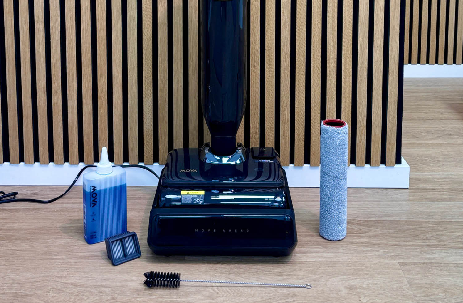 Zum Lieferumfang des Mova M50 Ultra gehören neben dem Wischsauger selbst eine kombinierte Basisstation, die sowohl das Aufladen als auch die automatische Selbstreinigung mit Heißwasser und anschließender Heißtrocknung übernimmt. Zusätzlich legt der Hersteller eine zweite Bürstenrolle, ein Reinigungstool für Wartungsarbeiten, einen Ersatzfilter sowie 500 Milliliter Reinigungslösung bei. Damit ist alles enthalten, um direkt nach dem Auspacken mit der Reinigung zu starten und den Sauger auch langfristig zu warten.