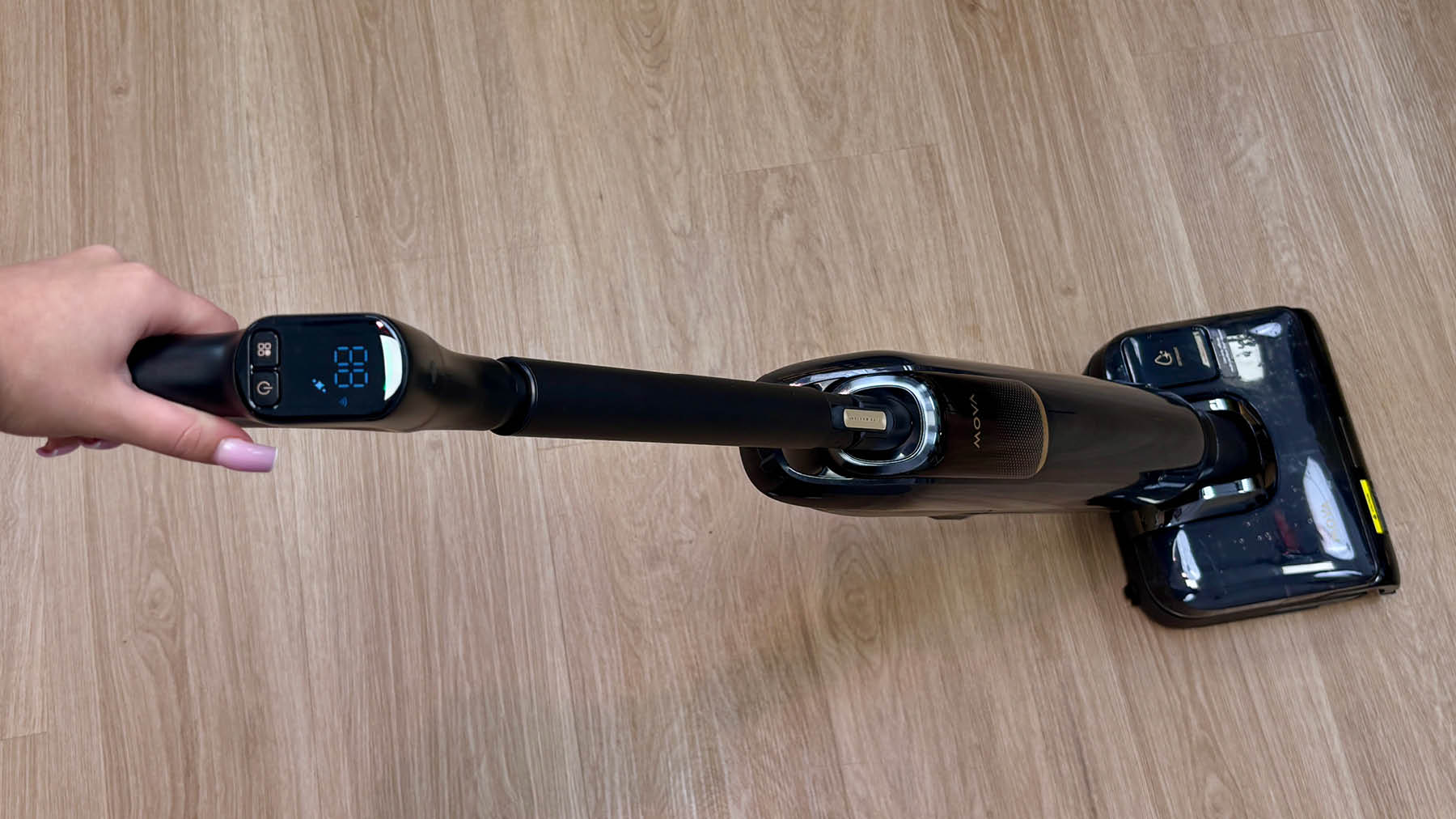 Am Handgriff des Mova M50 Ultra befinden sich die zentralen Bedienelemente. Dazu zählen eine Power-Taste, eine Taste zur Auswahl der Reinigungsmodi sowie eine separate Taste für die Selbstreinigungsfunktion. Zusätzlich sitzt dort der Auslöser für das Knickgelenk, über den sich der Sauger in eine flachere Position bringen lässt. Das integrierte Display zeigt den aktuell gewählten Modus sowie den Akkustand in Prozent an und liefert damit die wichtigsten Informationen auf einen Blick.