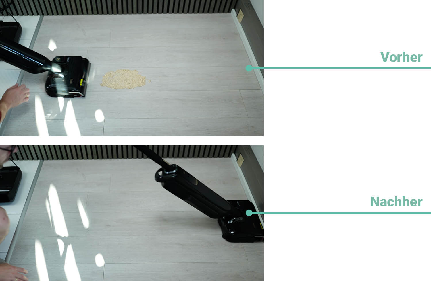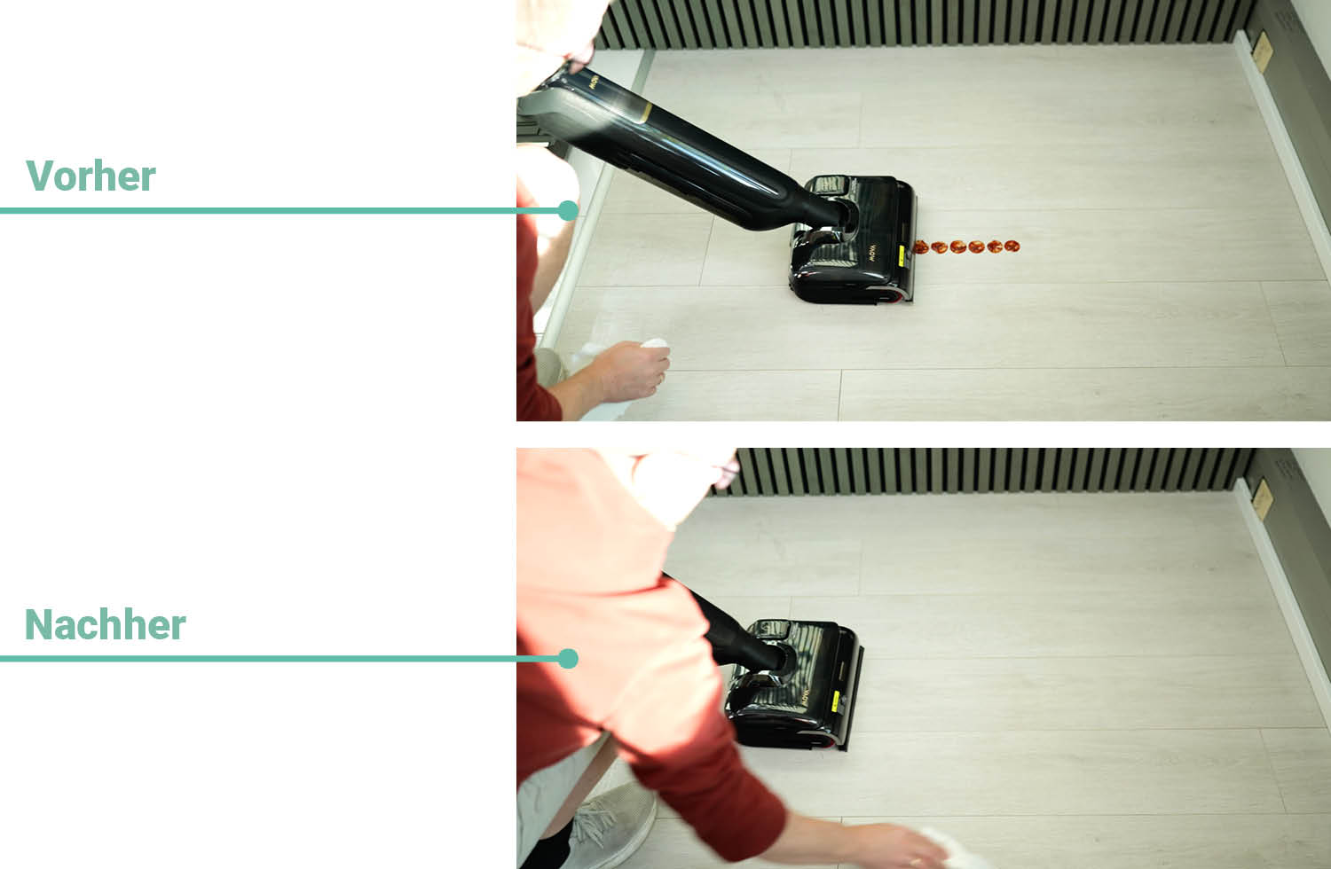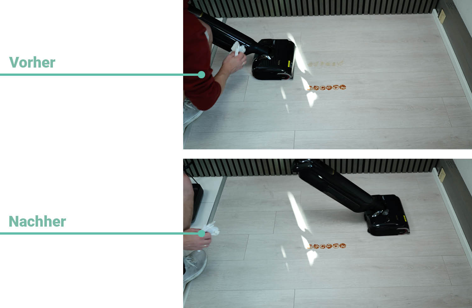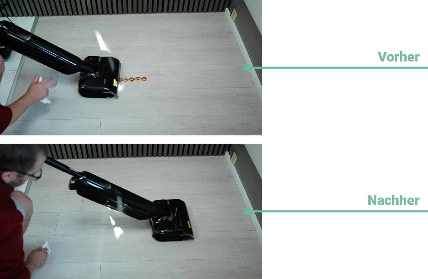 Um die Reinigungsleistung verschiedener Wischsauger zu vergleichen, testen wir sie immer unter gleichen Bedingungen. Diese bestehen aus flüssigen, dickflüssigen und vertrockneten Flüssigkeiten auf Hartboden. Wie oft ein Wischsauger über die Verschmutzung fahren muss, bis sie vollständig entfernt ist, ist dabei ausschlaggebend.