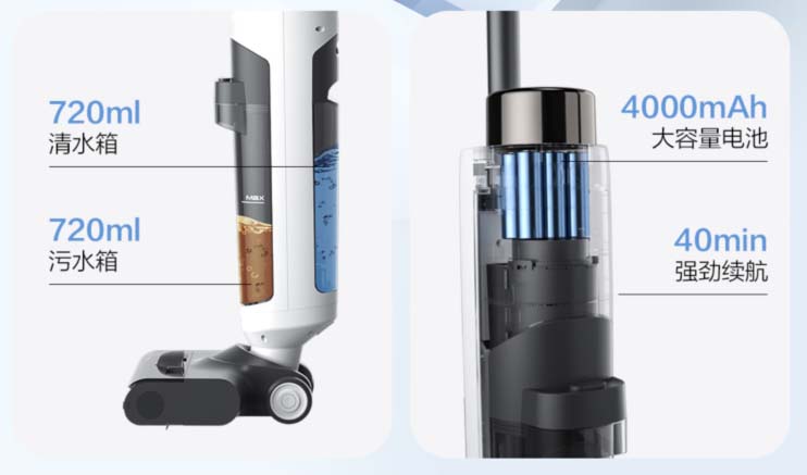 Beide Tanks haben übrigens das gleiche Fassungsvermögen von 720 ml. Dies ist ebenfalls einzigartig, denn bei allen anderen Geräten ist der Schmutzwassertank immer etwas kleiner als der Frischwassertank. Der 4.000 mAh starke Akku soll für eine Reinigung von bis zu 40 Minuten ausreichen. Hier schafft Roidmi mit dem Neo auf dem Papier 5 Minuten mehr als die bisherigen Spitzenreiter.
