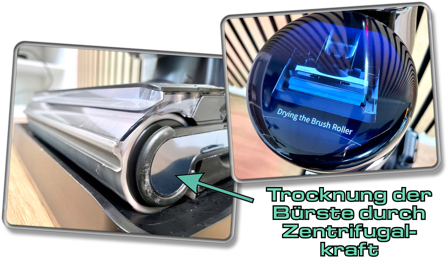 Um schlechte Gerüche und die Bildung von Keimen auf der Bodenbürste zu verhindern, muss diese anständig getrocknet werden. Der Tineco Floor One S7 Pro geht dabei einen ganz eigenen Weg. Er nutzt dabei kein Heißlufttrocknungsverfahren, sondern die Zentrifugalkraft. Die Bodenbürste wird dermaßen schnell um die eigene Achse gedreht, dass jegliche Feuchtigkeit herausgeschleudert wird. Der Vorgang dauert nur wenige Minuten und ist im Vergleich deutlich stromsparender, jedoch wird die Bodenbürste dadurch auch nicht Staubtrocken, sondern behält eine gewisse Restfeuchte.