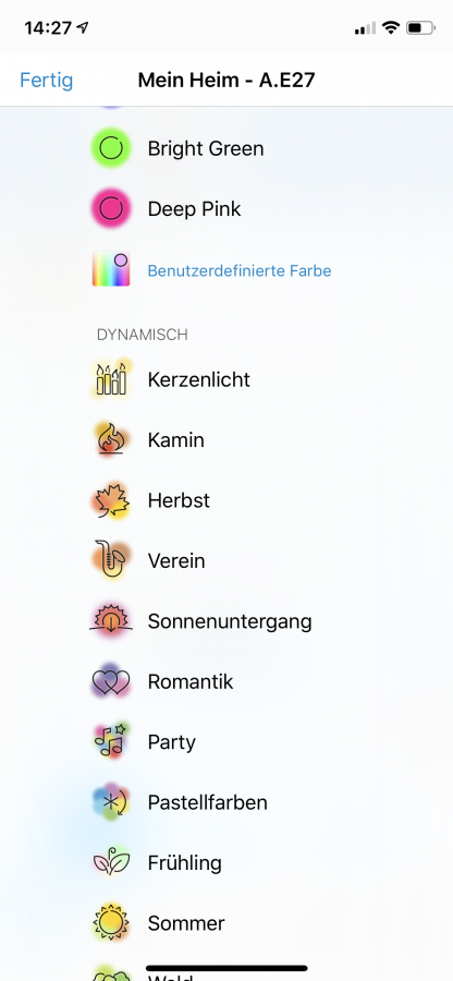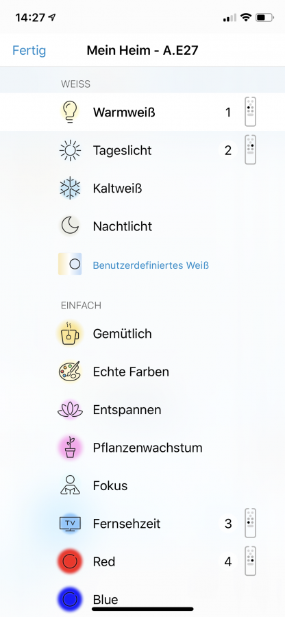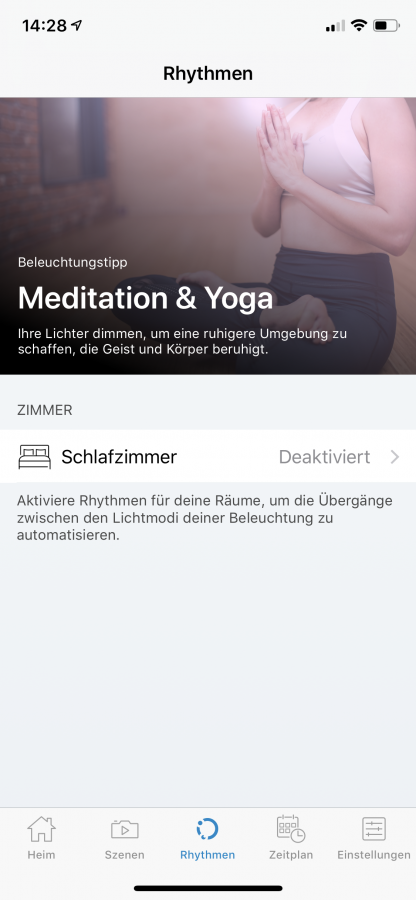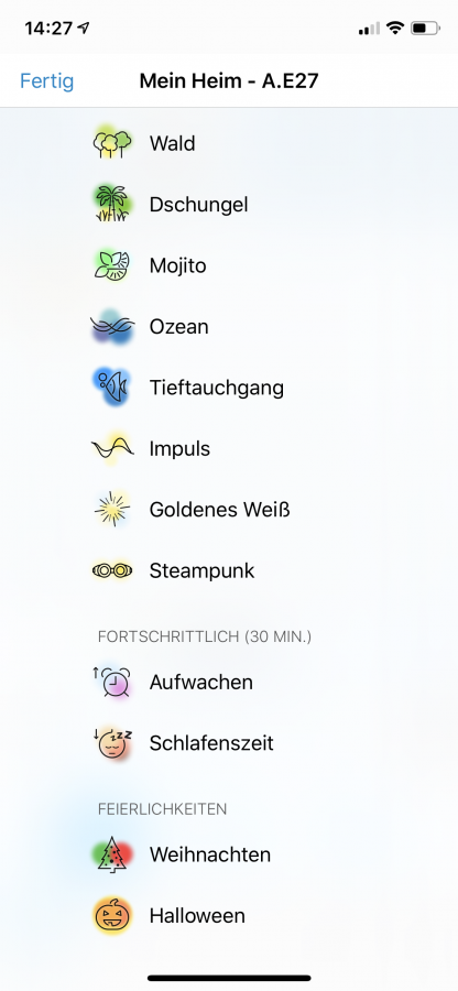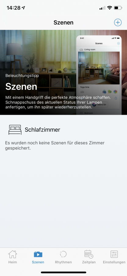 Man kann spezielle Szenen anlegen, die dann per Tastendruck einstellbar sind. So lässt sich zum Beispiel die aktuelle Farbe einfach per Schnappschuss übernehmen. Die App merkt sich dann die eingestellte Farbe und speichert sie in einer eigenen Szene. Somit kann ein angenehmes Licht in den Abendstunden gespeichert werden oder eine bestimmte Farbe für den Sport, die dann einfach durch einen Tastendruck ausgewählt werden kann.