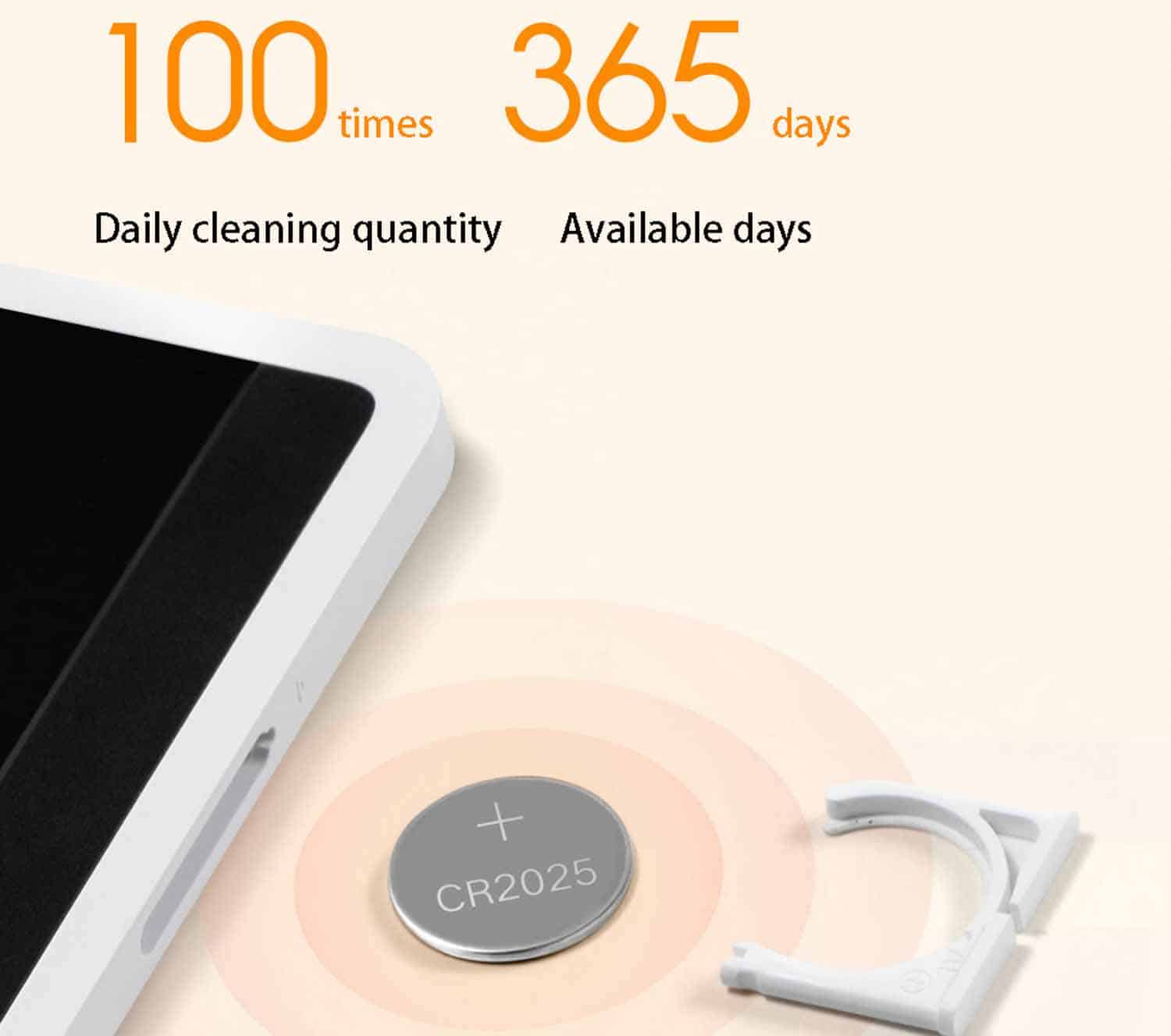 Die Schreibtafel von Xiaomi kommt nicht etwa mit einem verbauten Akku daher, sondern wird mit einer Knopfzelle betrieben. Eine einfache CR2025 Batterie sorgt für 365 Tage Malspaß mit 100 Löschvorgängen pro Tag. Da man tatsächlich wohl nie so viele Bilder am Tag anfertigt und wieder löscht, sollte diese also noch länger halten.